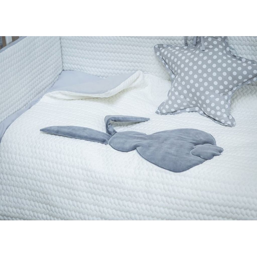 Dětská 3-dílná souprava do postýlky Belisima Králíček. Souprava je z jedné strany z úpletového materiálu zdobena 3D vzorem a roztomilým plyšovým králíčkem. Druhá strana je bavlněná. Je vyrobena z měkkého, příjemného materiálu. Obsahuje povlečení na polštářek cca 40x60 cm, povlečení na peřinku cca 100x135 cm a mantinel cca 31x175 cm. Složení: vrchní úpletová strana: 50% bavlna, 50% polyester. Spodní strana: 100% bavlna.
