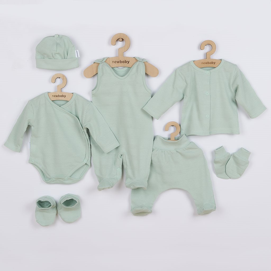Roztomilá kojenecká 7-dílná soupravička české značky New Baby I AM pro miminka. Soupravička je vyrobena z velmi příjemného, měkkého a kvalitního materiálu, který je vhodný pro miminka a je vhodná nejen do porodnice. Obsahuje celorozepínací body s dlouhým rukávkem, dupačky, polodupačky, kabátek, čepičku, rukavičky a capáčky. Body má boční zapínání po celé délce a mezi nožičkama na cvočky. Dupačky mají zapínání na cvočky na ramínkách a mezi nožičkama, coš usnadní oblékání a přebalování. Kabátek má zapínání na cvočky po celé délce. Čepička s širším lemem dobře drží na hlavičce miminka a nepadá. Je velmi praktická a netlačí na hlavičku miminka. Rukavičky a capáčky mají širší stahovací manžetku. Celá soupravička má nový neobyčejný design s atraktivním vzorem látky. Je navržena s ohledem na potřeby miminka a je vhodná i jako milý dáreček. Soupravička je v praktické Eko krabičce. Složení: 100% bavlna.