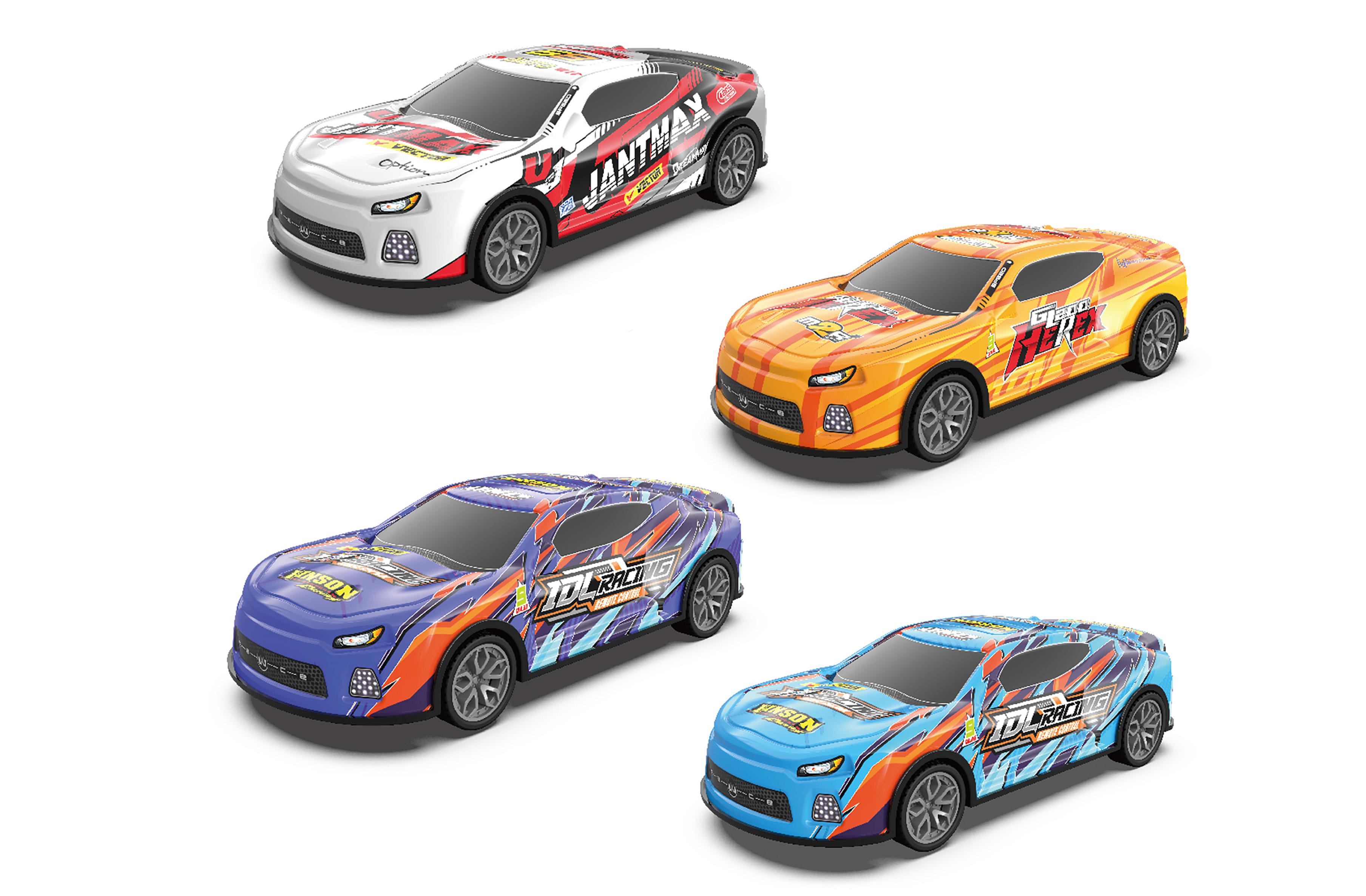 Auto driftovací kovové. Na setrvačník. Roztočte kola a pusťte. Velikost 17x8 cm. 4 varianty - modrá, fialová, oranžová, bílá.