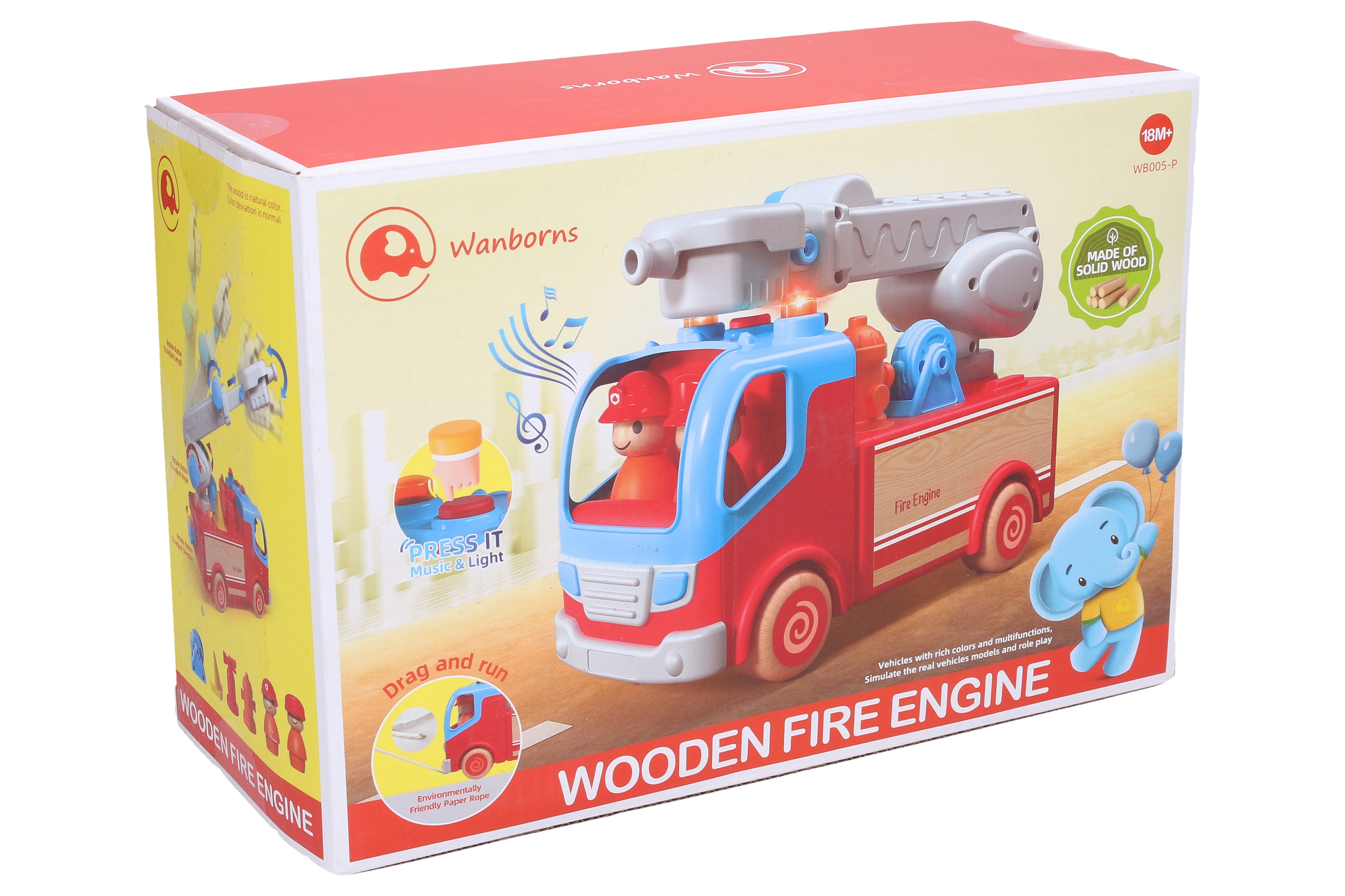 Auto hasičské dřevo/plast s efekty. Velikost 25cm. Světelné a zvukové efekty. Baterie 3xAG13 součástí. Provázek na tahání auta.