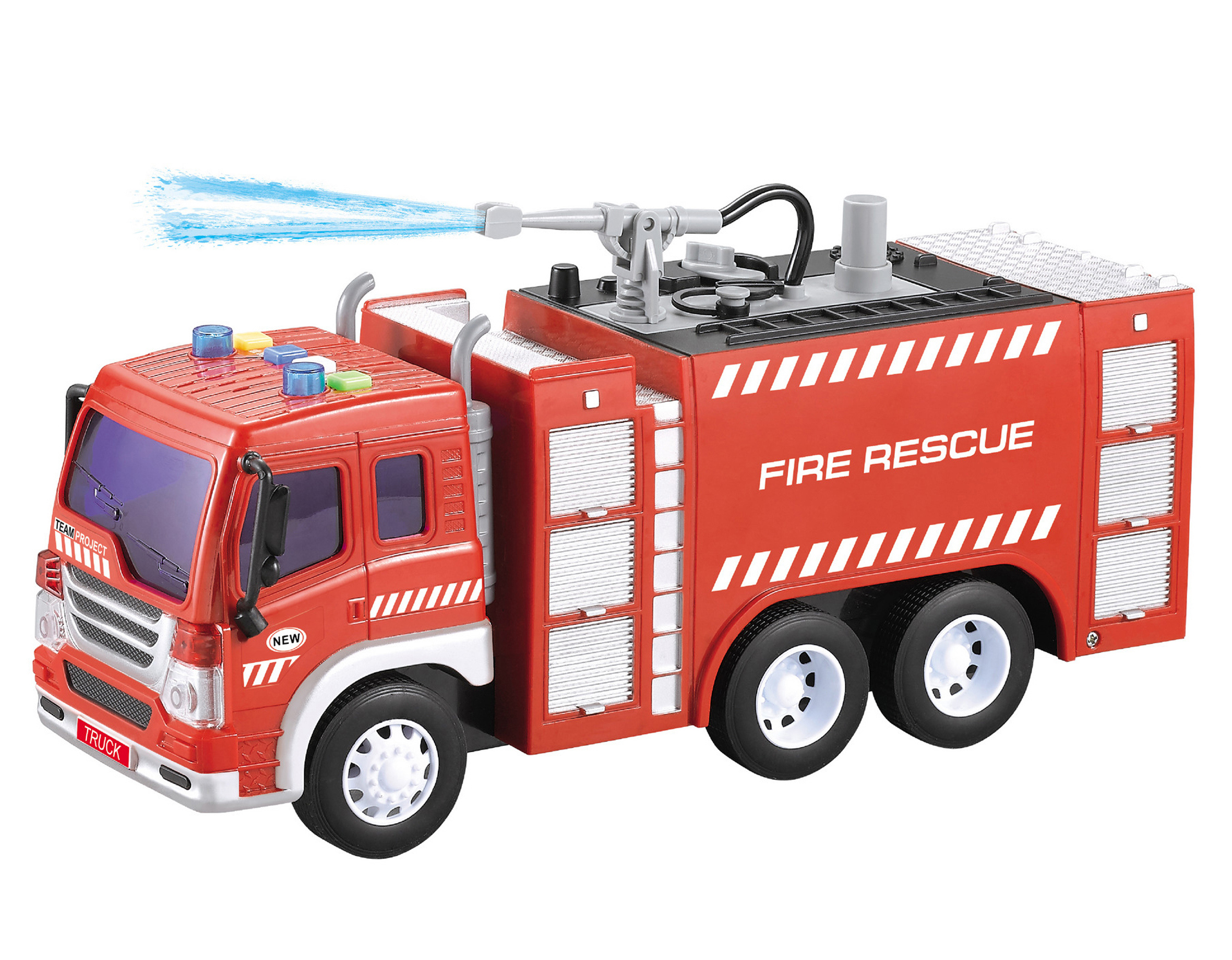 Hasičský vůz s vodním dělem, 27 cm. 4 tlačítka s různými světelnými a zvukovými efekty. Funkční vodní dělo. Nádržka na vodu se nachází na střeše auta, uzavřená černou zátkou. Šedým tlačítkem na střeše se pumpuje voda do vodního děla. 3xAG13, součástí. Try me funkce na obalu.