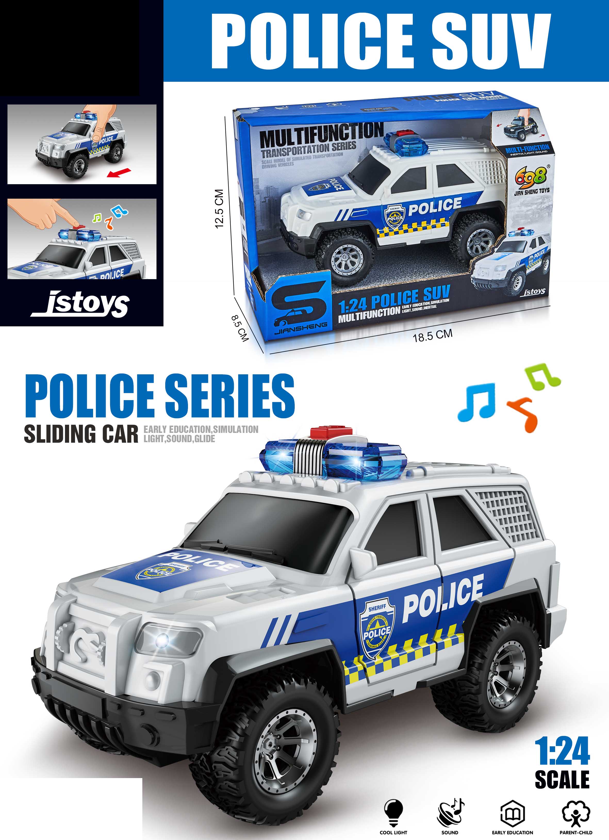 Auto policejní s efekty. Velikost 15 cm. Volná kola. Světelné a zvukové efekty, kativace tlačítkem na střeše. 3xAG13 baterie součástí.