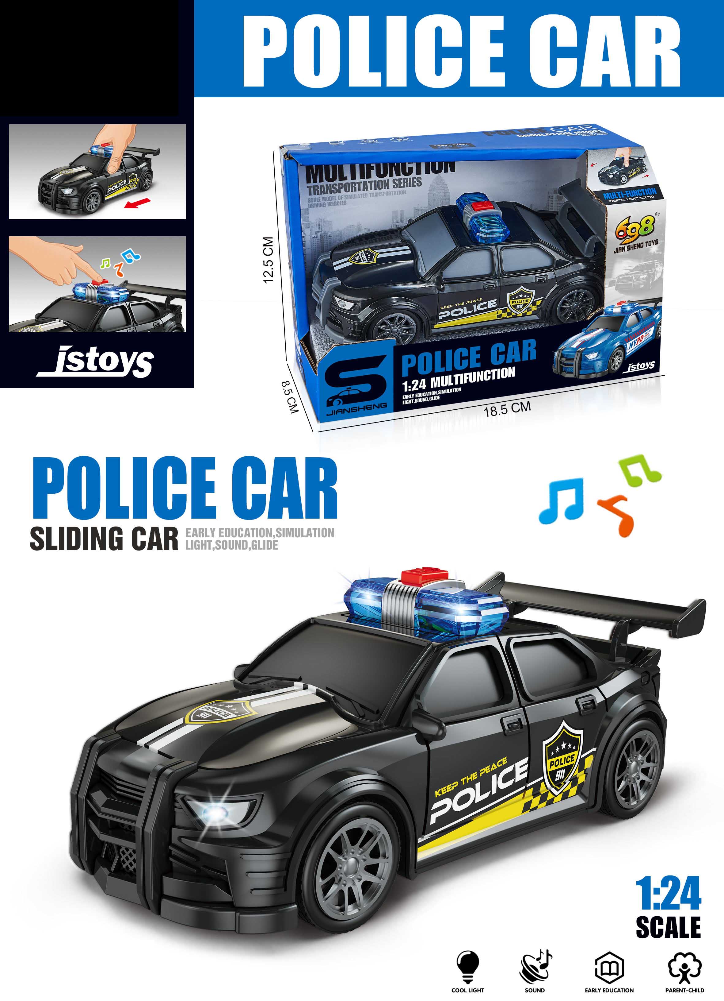 Auto policejní s efekty. Velikost 16 cm. Volná kola. Světelné a zvukové efekty, aktivace tlačítkem na střeše. 3xAG13 baterie součástí.