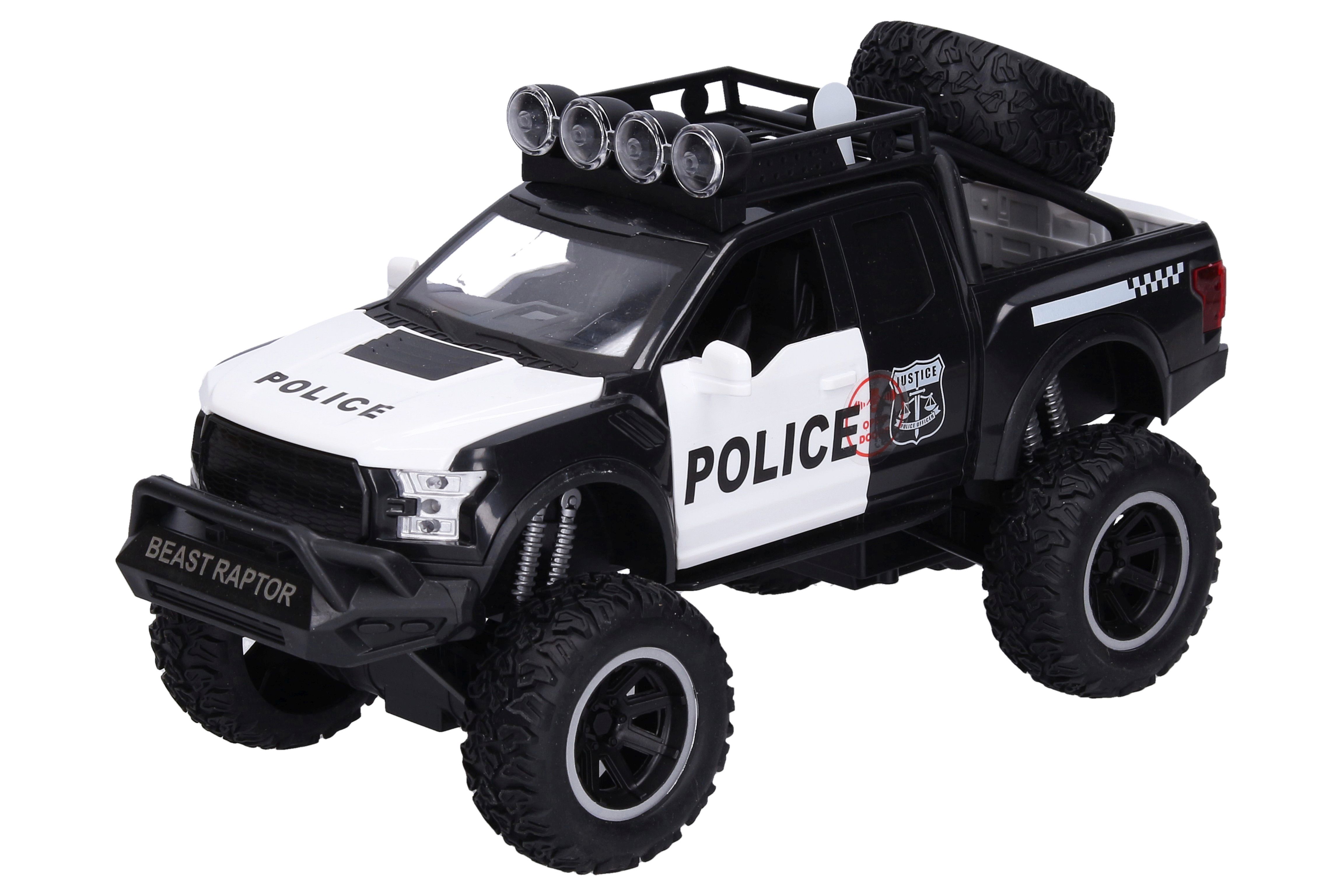 Auto policie terénní s efekty. Velikost 26 cm. Vydává světelné a zvukové efekty. Aktivace tlačítky na střeše, zvuky couvání, troubení, motor, startování motoru. Baterie 3xAG13 součástí. Na setrvačník.