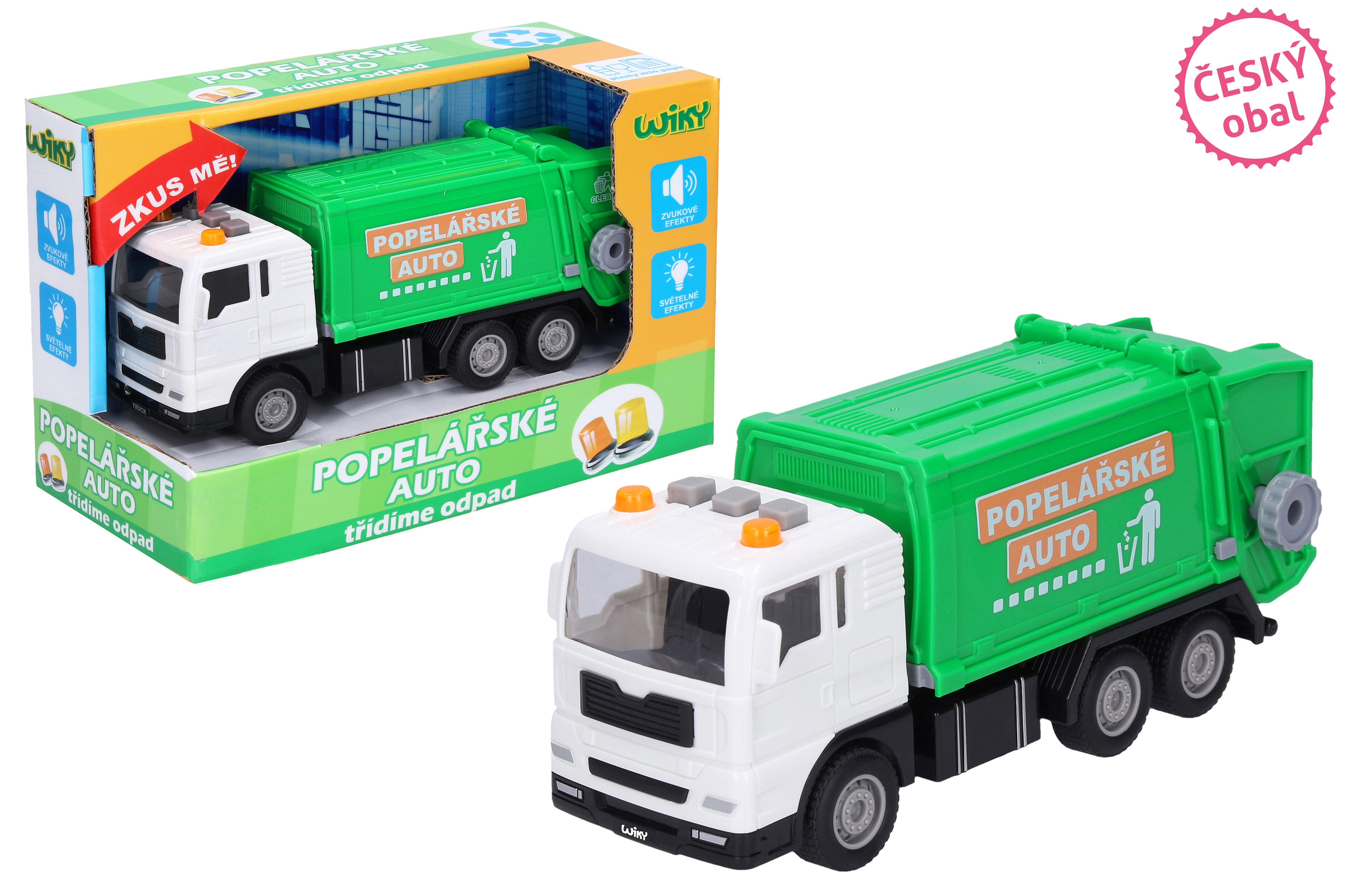 Auto popelářské. Velikost 17 cm. Na setrvačník. Světelné a zvukové efekty tlačítky na kabině. 3xAG13 baterie součástí.