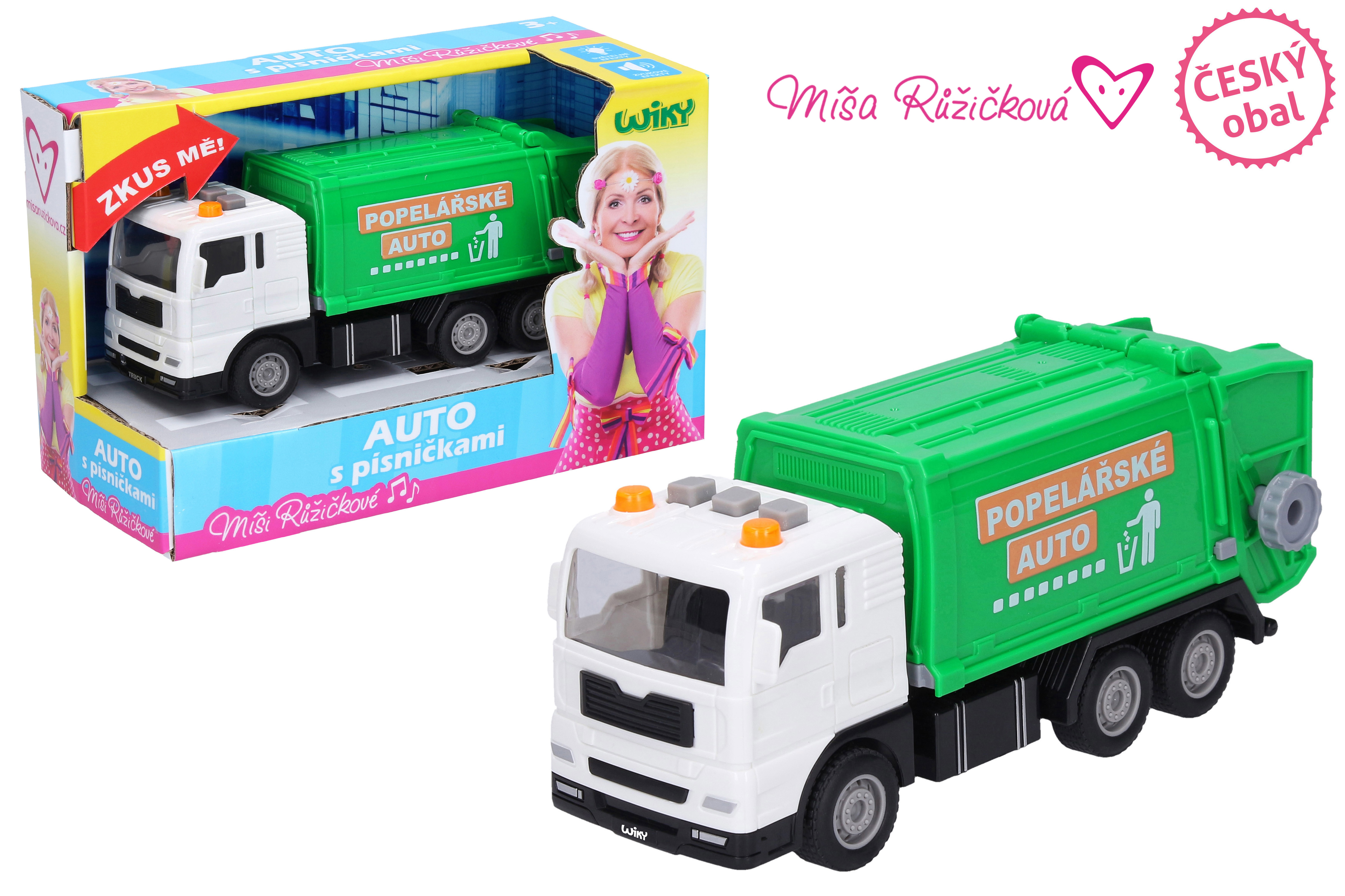 Auto popelářské - Míša Růžičková. Velikost 17 cm. Na setrvačník. Světelné a zvukové efekty, tlačítky na kabině 3 písníčky Míši Růžičkové - Popeláři, Policejní, Sanitka. 3xAG13 baterie součástí.