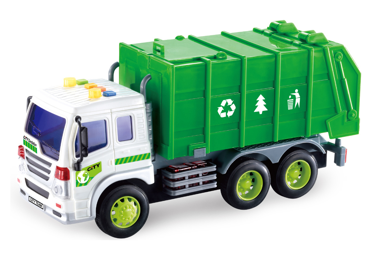 Auto popelářské s efekty. Velikost 28 cm. Na setrvačník. Světelné a zvukové efekty - tlačítka na kabině. 3xAG13 baterie součástí.