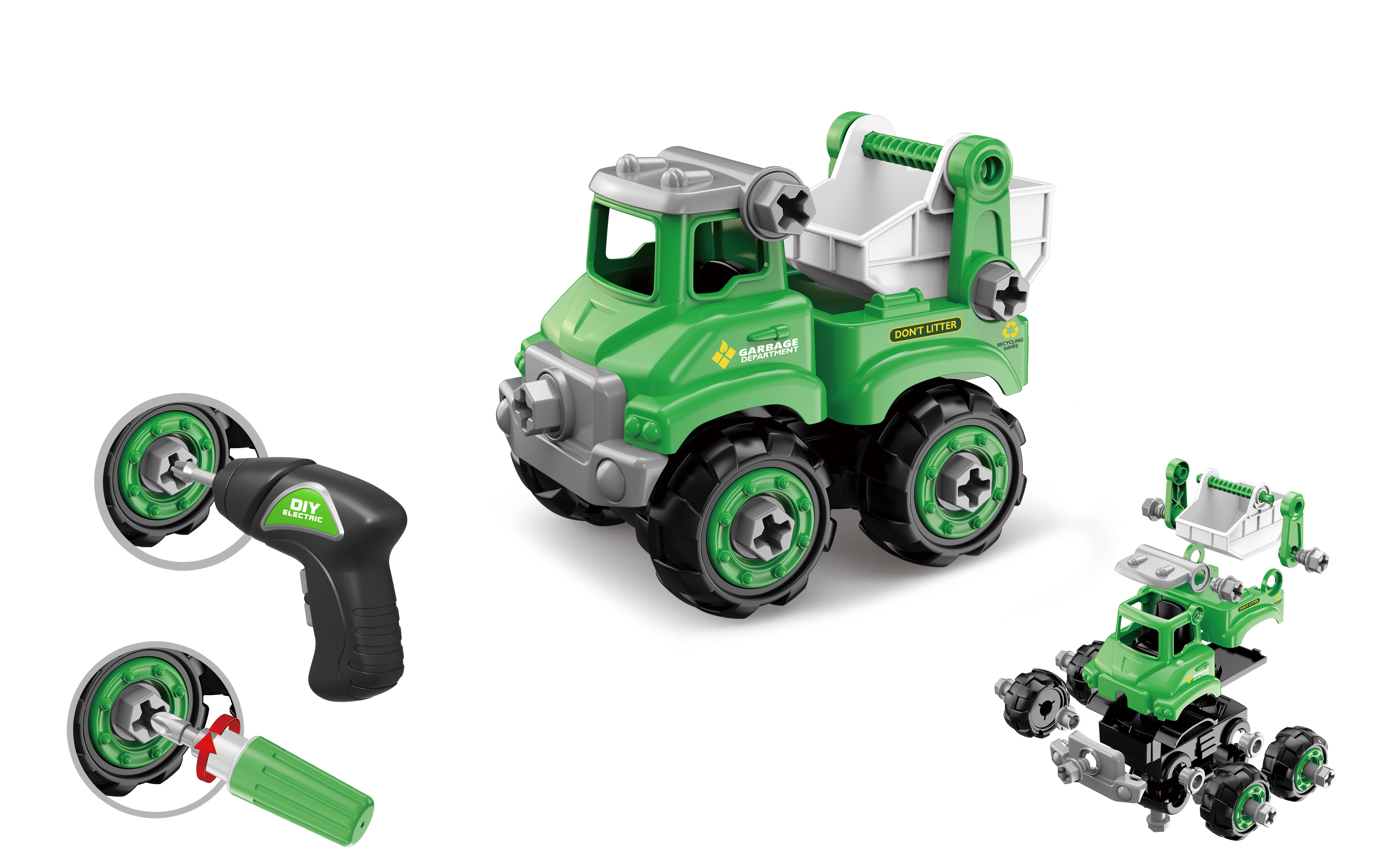 Auto šroubovací set s elektrickým šroubovákem. Obsah balení - popelářské auto (rozměry 17x14x12 cm), manuální šroubovák 11,5 cm, elektrický šroubovák 18 cm. 2xAA baterie, nejsou součástí.