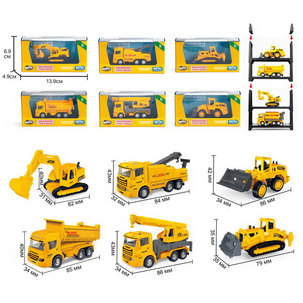 Auto stavební kovové. Rozměry 8,5x3,4x4,3 cm. 6 variant - bagr, odtahovka, nakladač, sklápěč, jeřáb, buldozer.