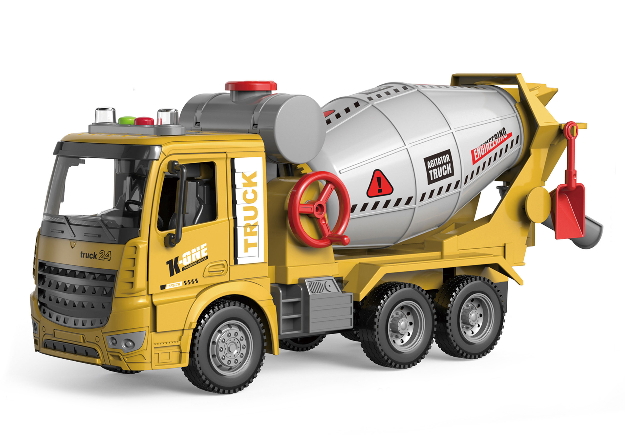 Auto stavební domíchávač na setrvačník s efekty. Velikost 31 cm. Vydává světelné a zvukové efekty. Aktivace tlačítky na střeše (1 tlačítko - zvuk motoru, zvuk míchání, 2 tlačítko - zvuk couvání, zvuk troubení. Baterie 3xAG13 (1.5V), součástí balení.