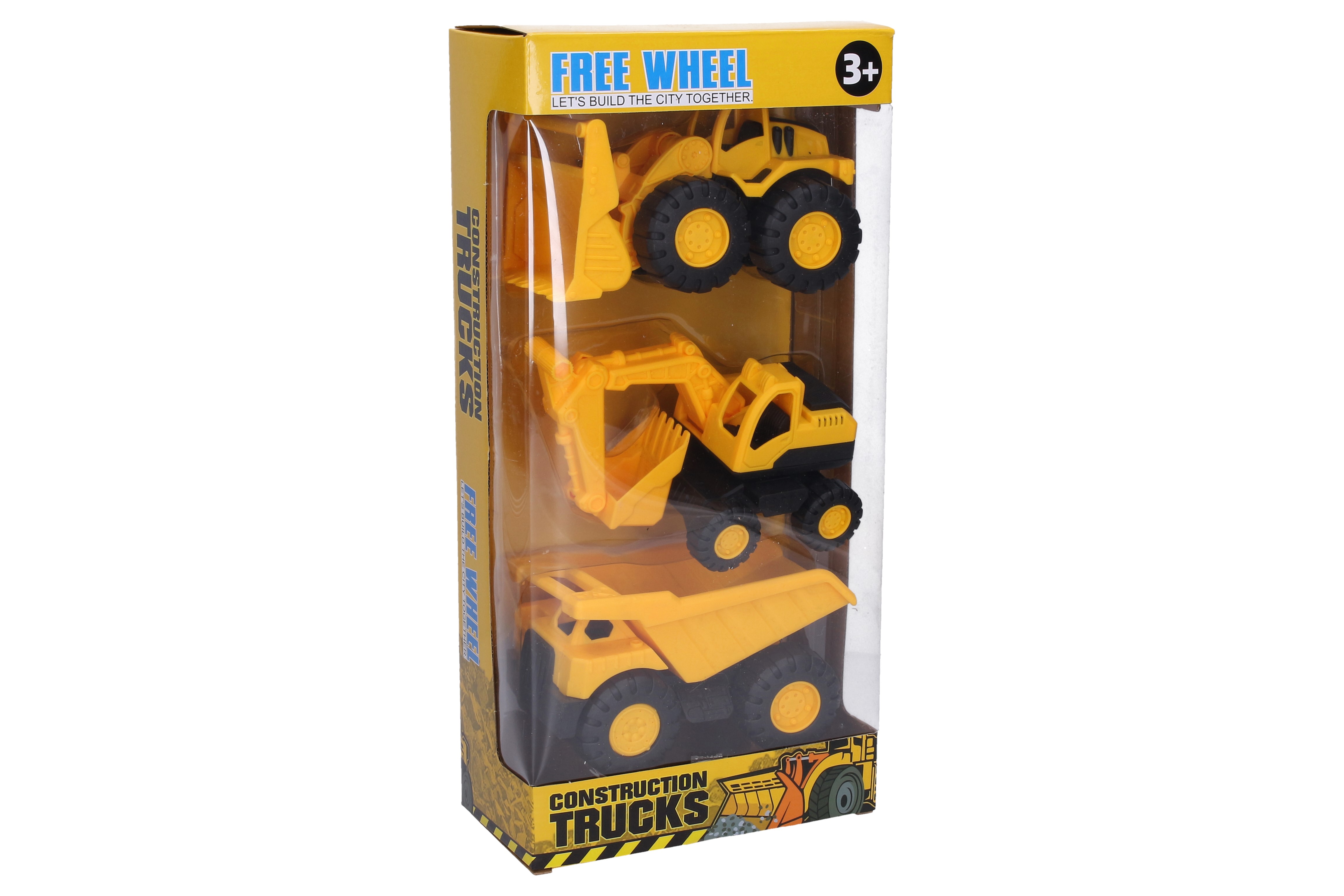 Auto stavební stroj. Velikost 12 cm. Balení obsahuje 3 ks - buldozer, bagr, sklápěč. Sklápěč má sklápěcí korbu. Bagr a buldozer mají polohovatelné lžíce. Volná kola.