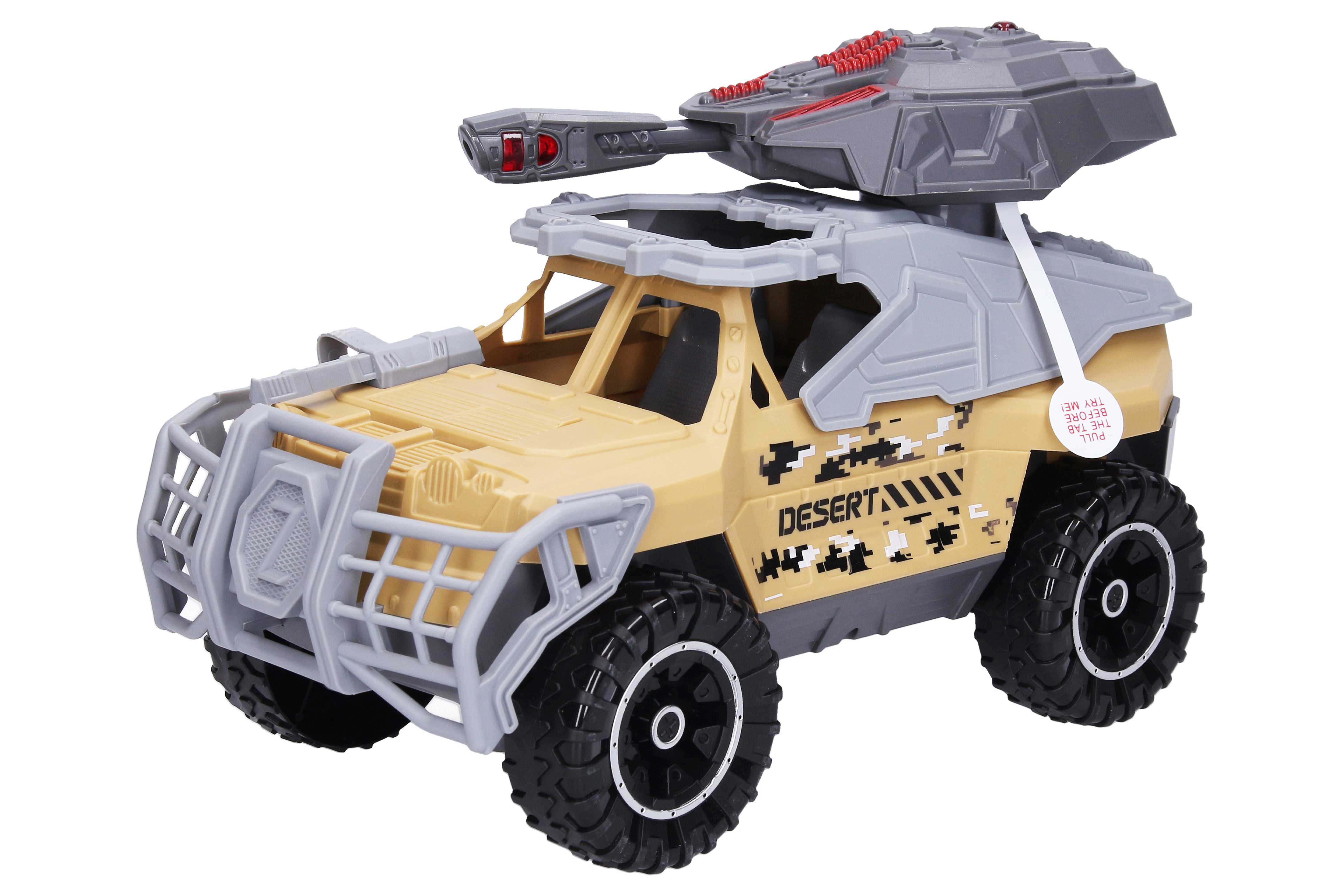 Auto vojenské s dělem a efekty. Rozměry 33,5x16,5x22 cm. Na setrvačník. Světelné, zvukové, a pohybové efekty, aktivace tlačítkem na otočné dělové věži.