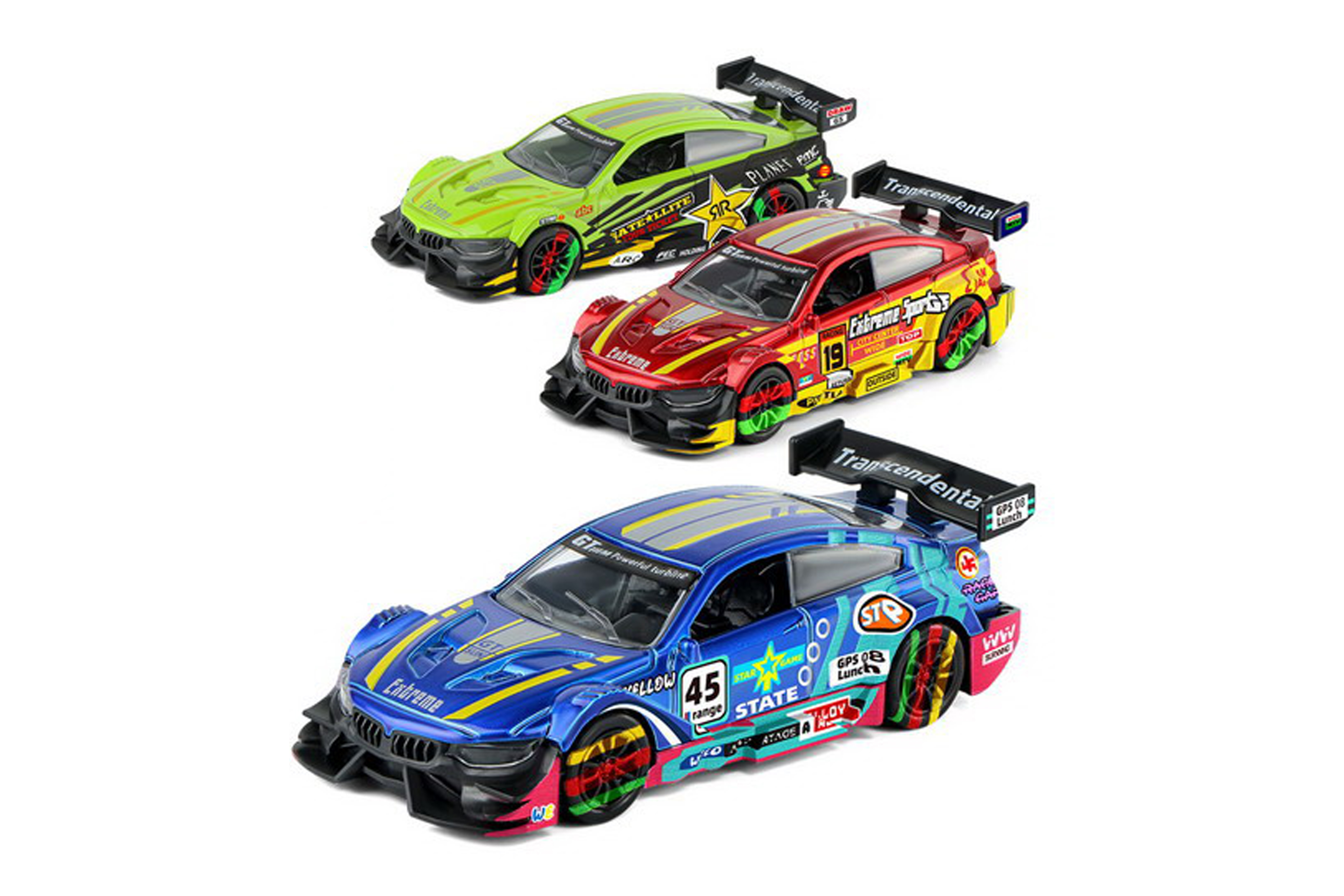 Auto závodní kovové. Rozměry 11x4,5x3,2 cm. Na zpětné natažení. 3 varianty - zelená, červená, modrá.