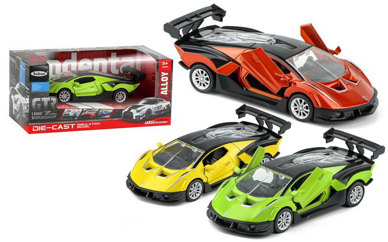 Auto závodní kovové na zpětné natažení. Přesné rozměry 12x5,2x3,2 cm. 3 varianty - červená, žlutá, zelená.