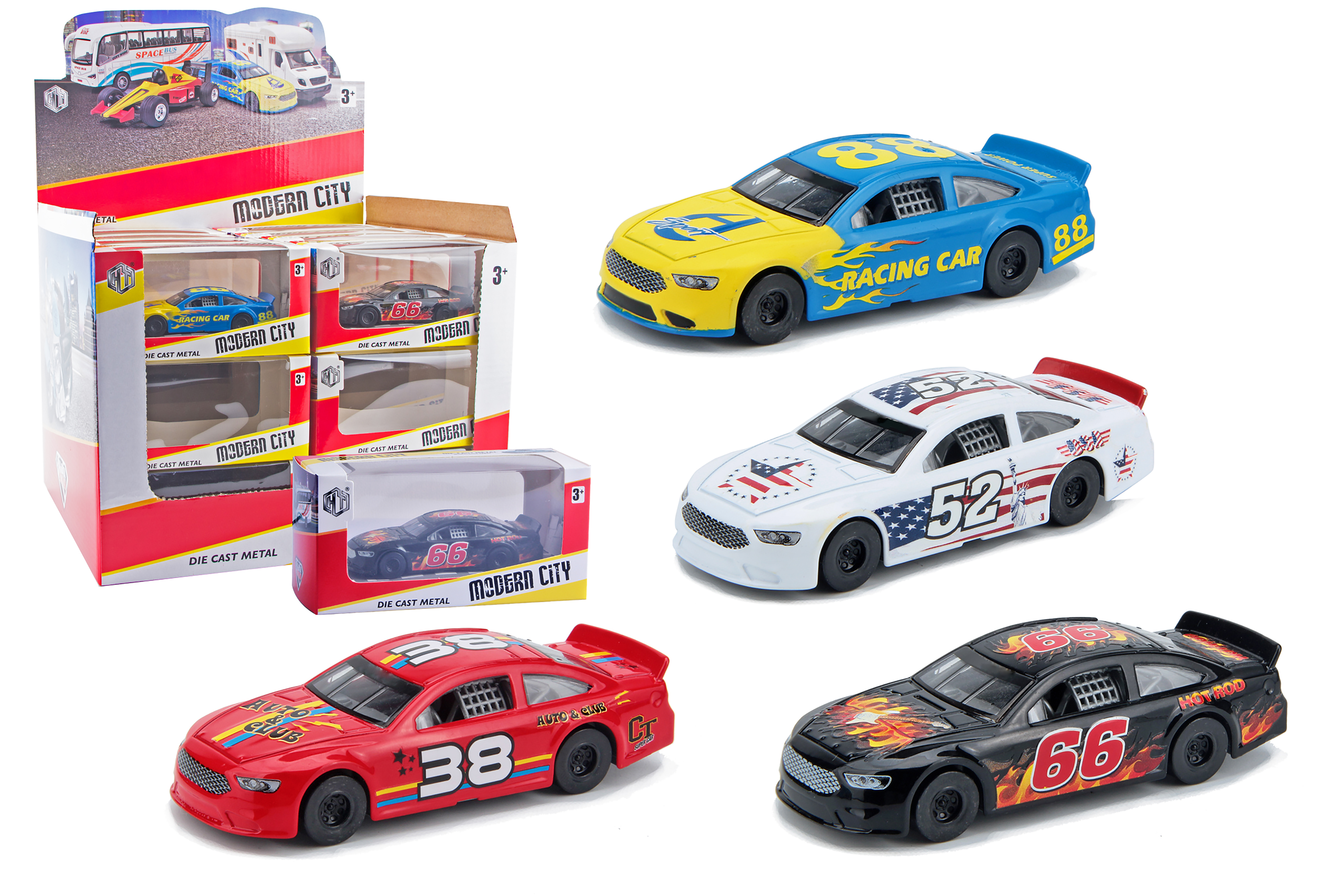 Auto závodní na zpětné natažení. Rozměry auta 10,5x4,2x2,8 cm. Display box 24 ks. 4 varianty - modrá, bílá, červená, černá.