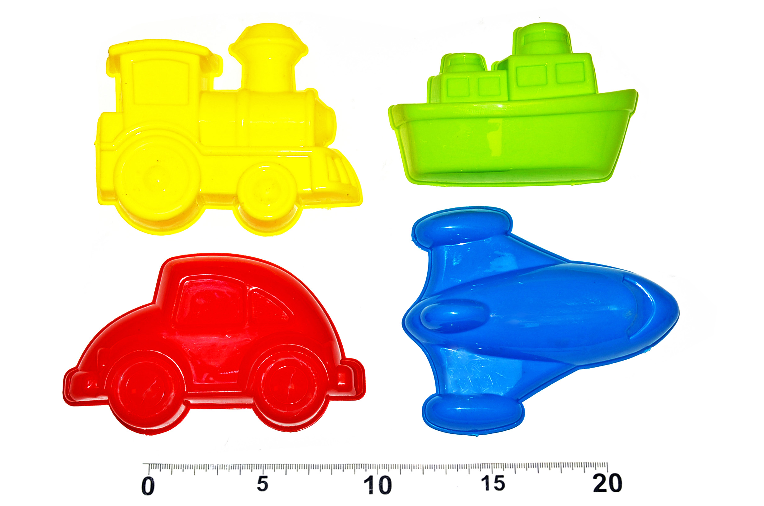 Sada na písek 4 ks. Délka 12 cm. Balení osahuje 4 formičky - loďku, auto, vlak a raketu.