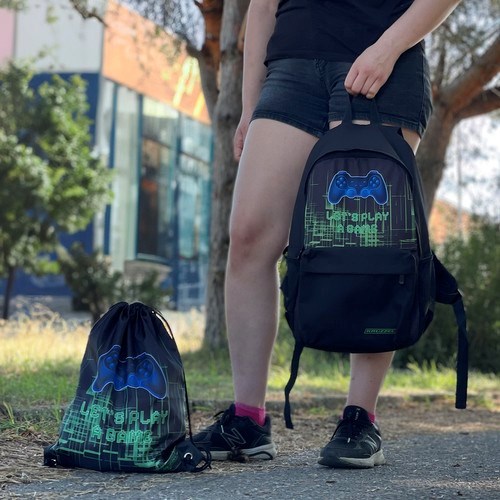 Vak na obuv nebo sportovní výbavu v designu ladícím s batohu, s herní grafikou na přední straně a černým zadním panelem. Vyroben z polyesteru, odolného vůči oděru, snadno se čistí. Pevné dvojité šňůrky umožňují nošení jako batůžku – praktické řešení pro sportovní aktivity.