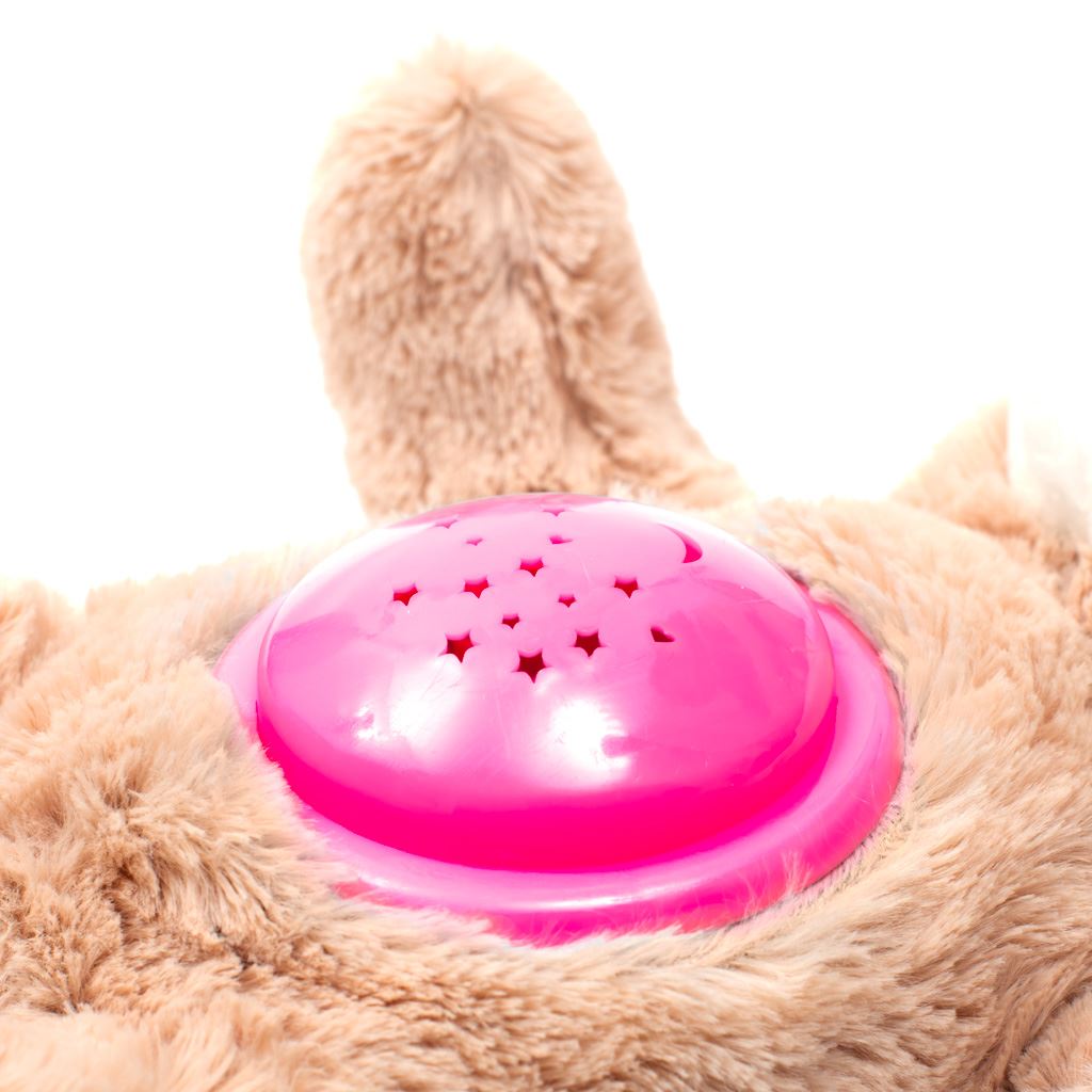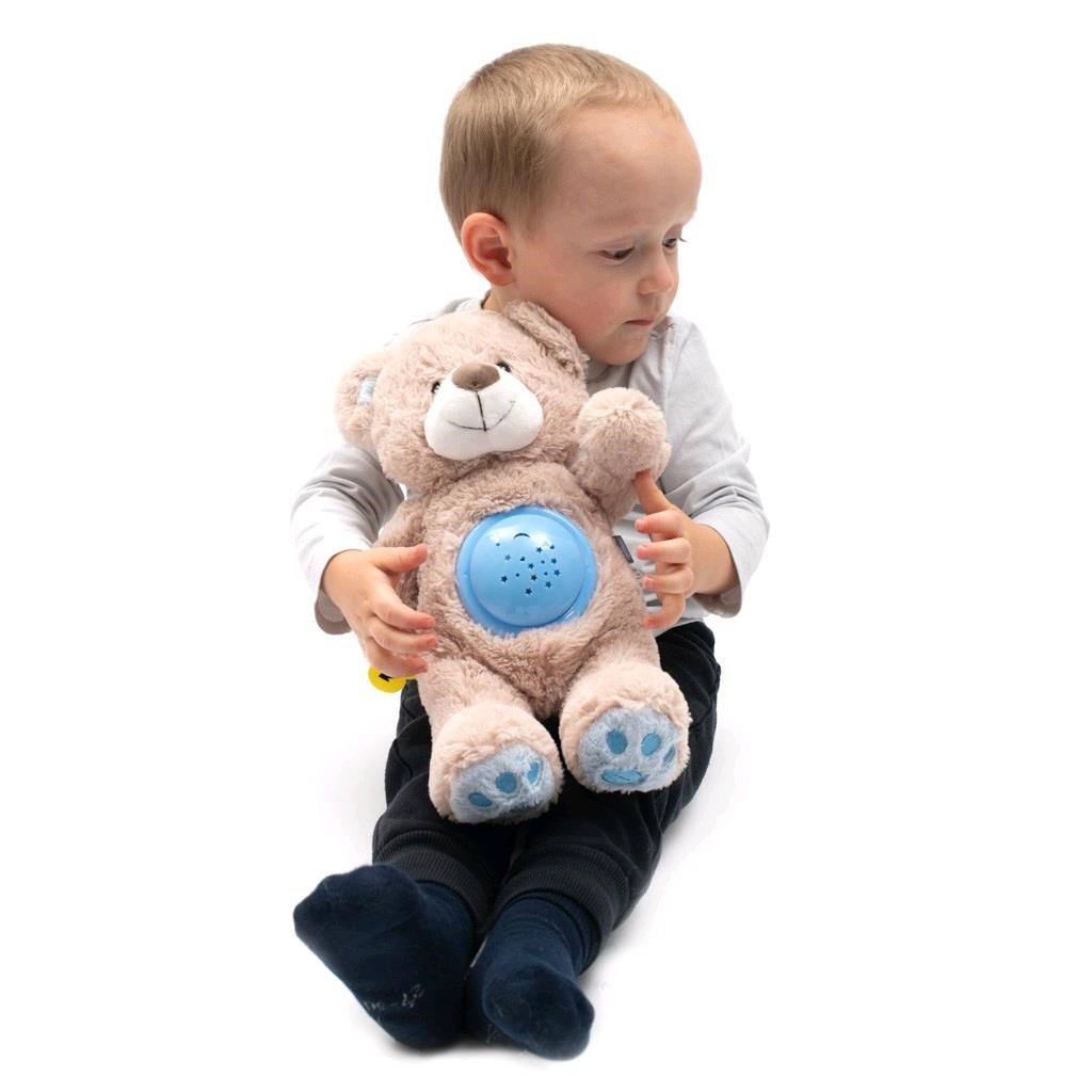 Roztomilý plyšový medvídek s projektorem Baby Mix. Hračka je vyrobena z měkké plyšové látky a je velmi příjemná na dotek. Malým dětem zpříjemní usínání. Po stisknutí tlačítka umístěného na tlapce zapnete světýlko které mění barvu a poslouží jako maličká noční lampička a zároveň se spustí jemné melodie. Dítě může poslouchat jemnou ukolébavku. Medvídka si aktivujete pomocí tlačítka on / off, který je ukrytý v zádíčkách medvídka. Modul je na baterie. Baterie jsou součástí balení. 3x Typ AA 1,5 V. Hračka je vhodná pro děti od 6 měsíců. Rozměry: cca 34 cm.
