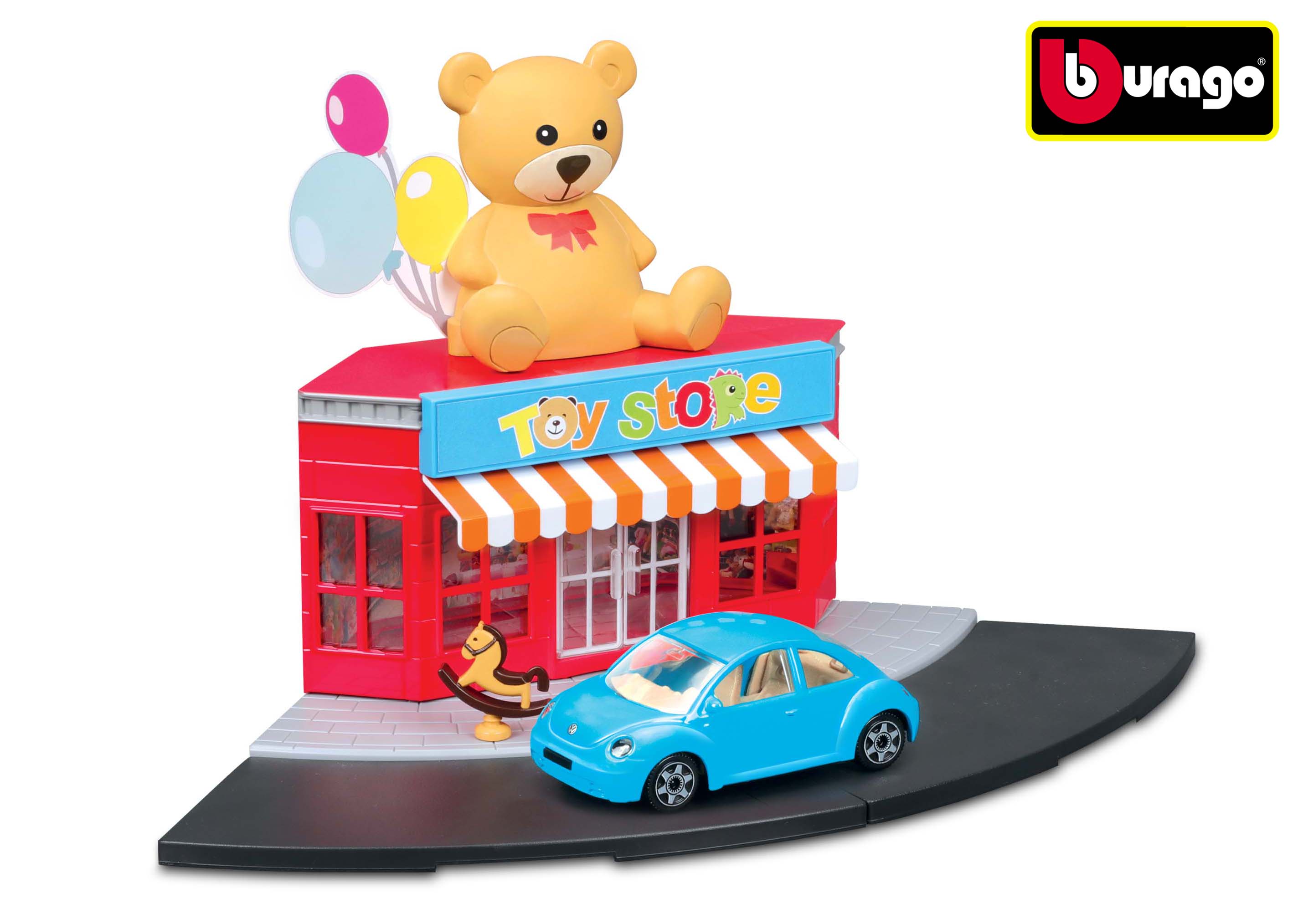 Kovový model ze serie Bburago city 1:43 18-31511 Hračkářství. Karosérie modelů je vyrobena z kovu a obsahuje velké množství detailů. Vždy jste chtěli postavit vlastní město? Nyní je to možné s městskými sadami her ze série Bburago StreetFire. Hračkířství  obsahuje kromě plastové budovy s pohyblivými dveřmi také pouliční a chodníkový komponent a různé doplňky. A nejlepší věc? Dostanete také skvělé auto Bburago v měřítku 1:43. Hrací sadu lze kombinovat s dalšími hracími sadami série