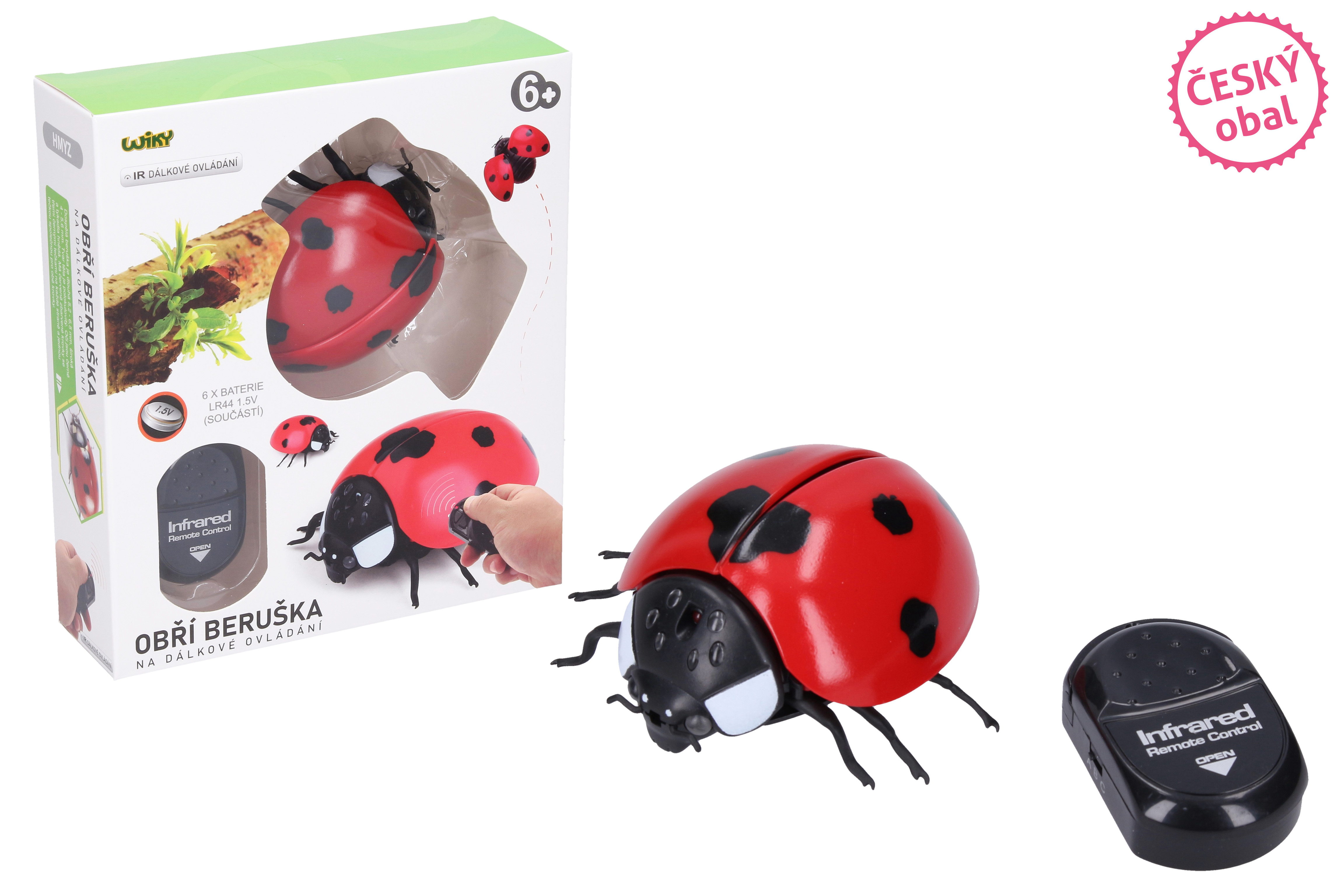 Obří beruška na dálkové ovládání. Velikost 9 x 9 cm. Infračervený port. Ovládání - dopředu, couvání doprava, demo. Výdrž až 20 min, dosah 10 m. Beruška - 3 x LR44 baterie součástí, ovladač - 3xLR44 baterie, součástí.