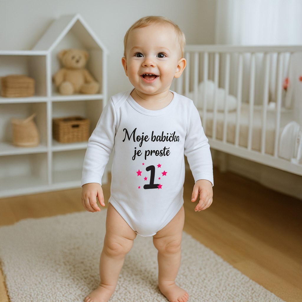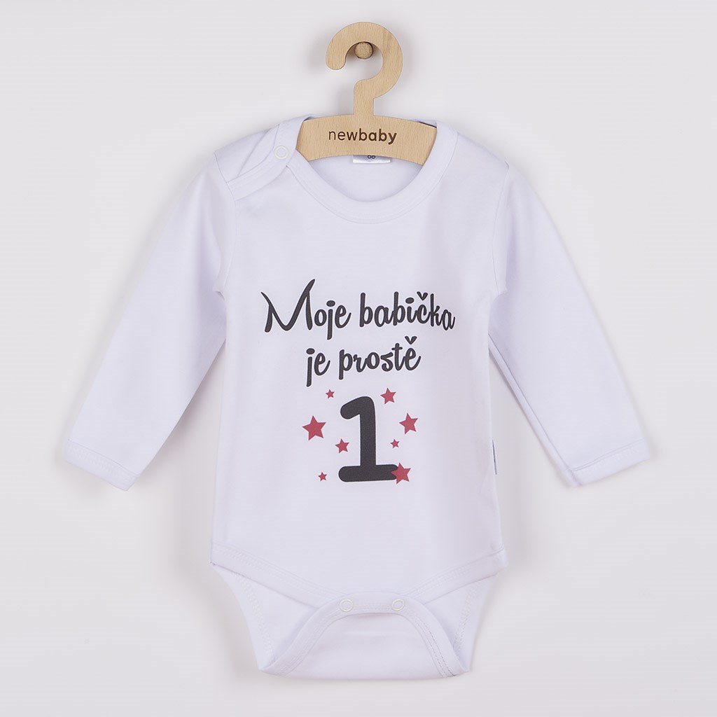 Originální bavlněné kojenecké body s dlouhým rukávem New Baby, s vtipným nápisem Moje babička je prostě jednička. Barvy použité k potisku jsou certifikované a vhodné pro miminka. Je vyrobeno z příjemného a kvalitního materiálu, ve kterém se bude Vaše miminko cítit příjemně. Body má zapínáni na cvočky na ramínku a mezi nožičkami, což usnadňuje oblékání a přebalování. Dopřejte Vašemu miminku vyniknout v originálním body. Složení: 100% bavlna. Rozměry: obvod kolem hrudníku cca 34 cm, délka rukávu cca 16 cm, celková délka cca 30 cm.