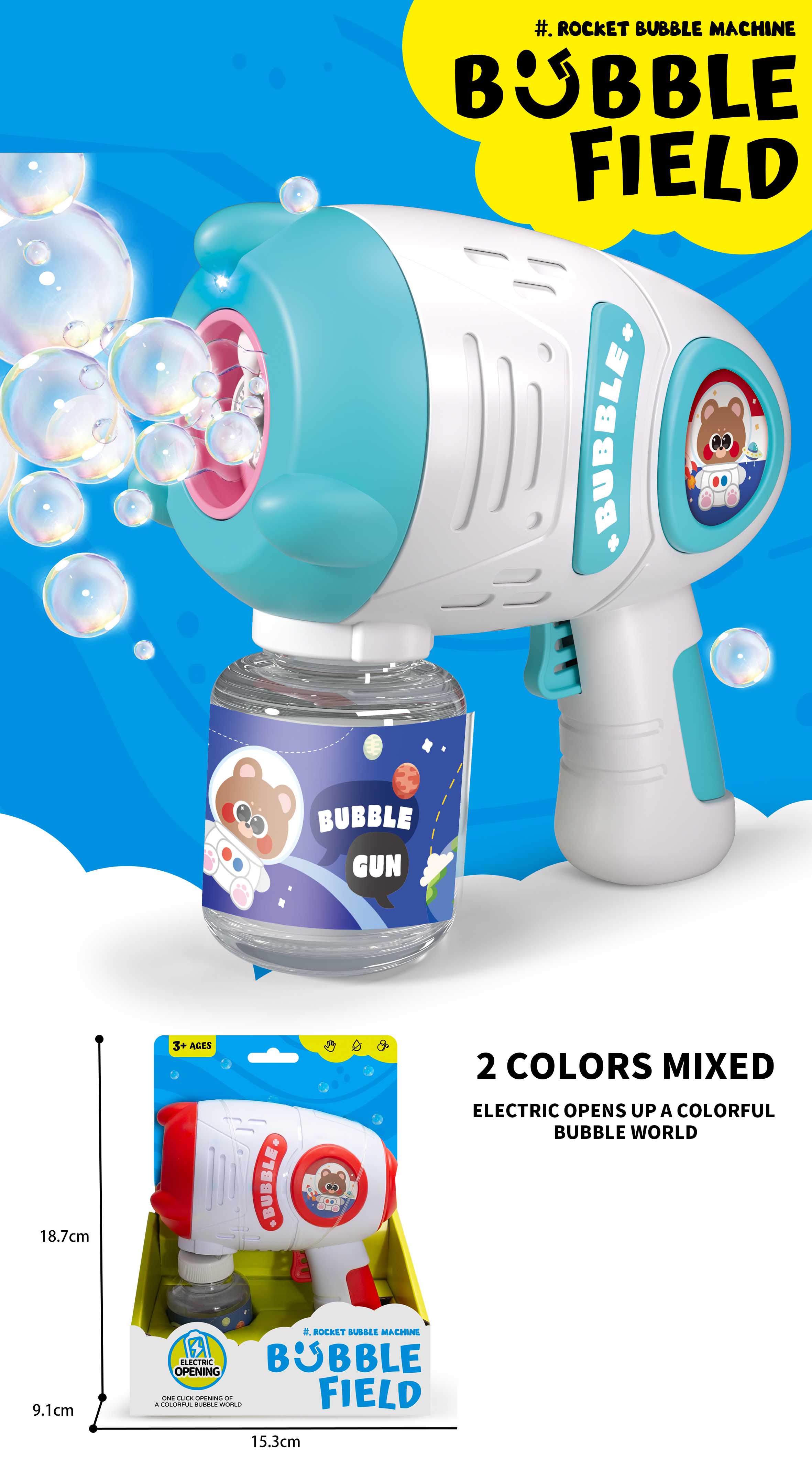 Bublifuk pistole. Objem 80 ml. Světelné efekty. 4xAA (1.5V) baterie nejsou součástí. 2 varianty - modrá, červená. Balení obsahuje 80 ml náplň.