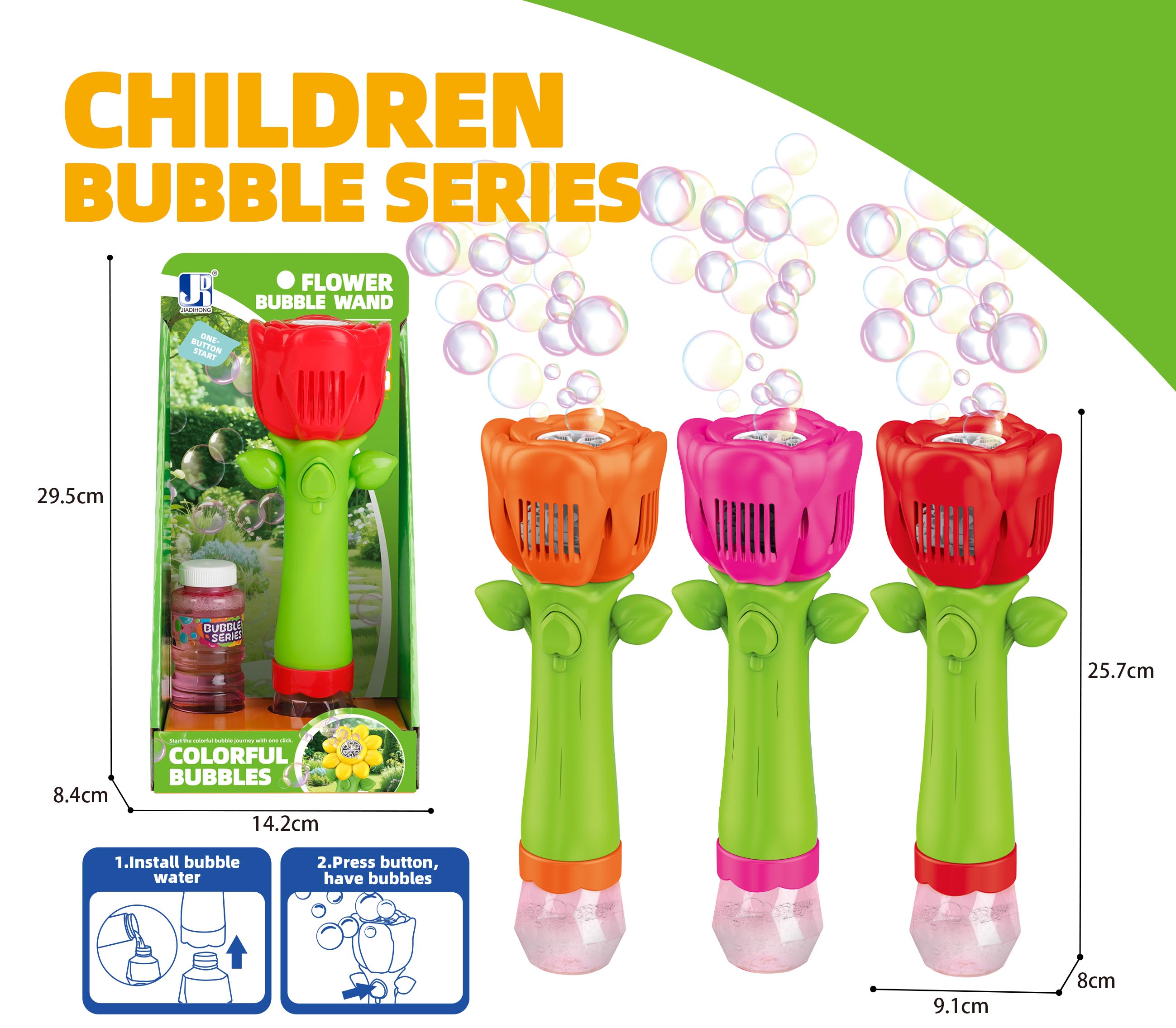 Bublifuk růže. Objem 100 ml. Rozměry 9,1x8x25,7 cm. Světelné efekty. 4xAA (1.5V) baterie nejsou součástí balení. 3 varianty - oranžová, růžová, červená. Balení obsahuje 100 ml náplně.