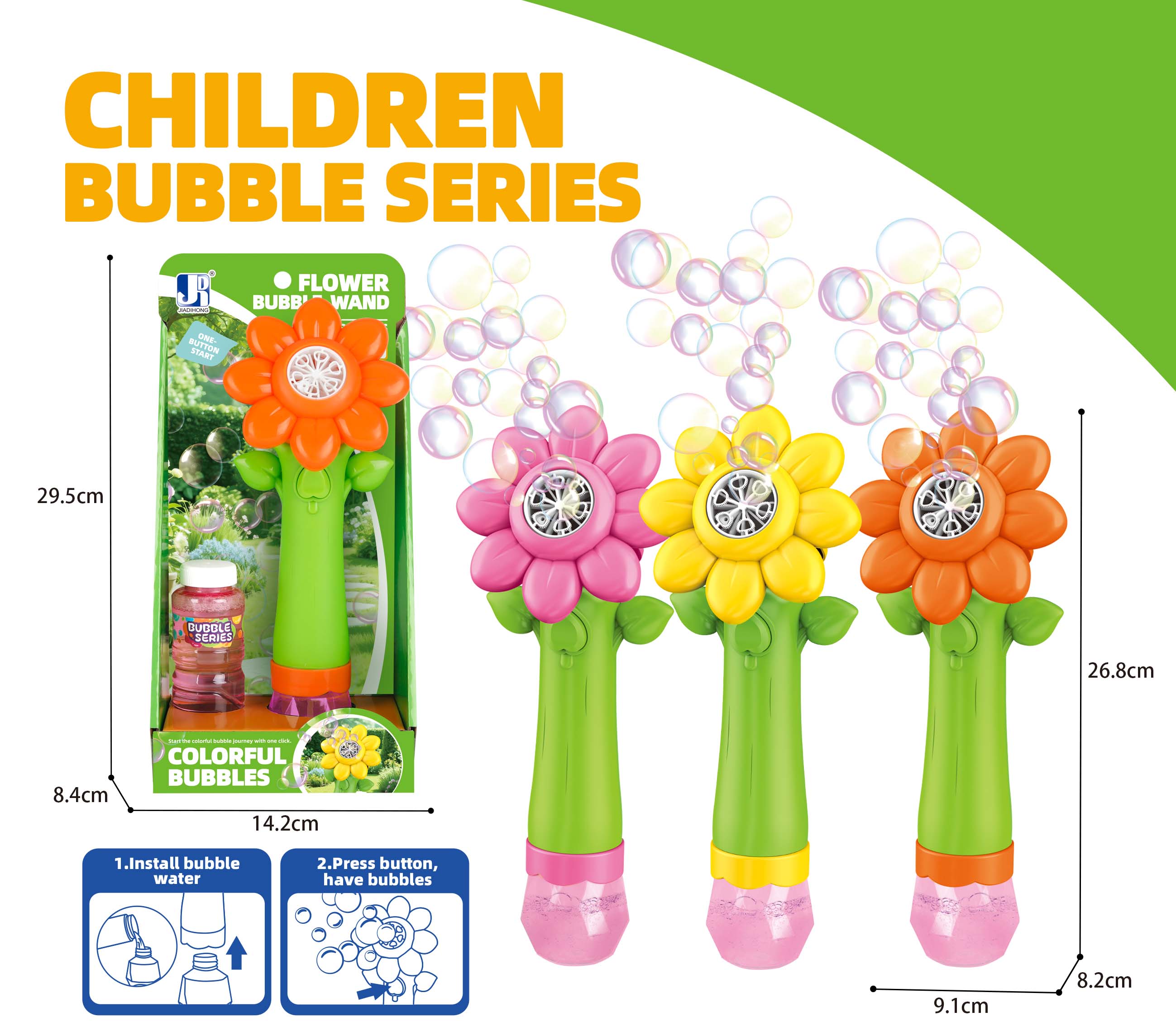 Bublifuk slunečnice. Objem 100 ml. Rozměry 9,1x8,2x26,8 cm. Světelné efekty. 4xAA (1.5V) baterie nejsou součástí balení. 3 varianty - žlutá, fialová, oranžová. Balení obsahuje 100 ml náplně.