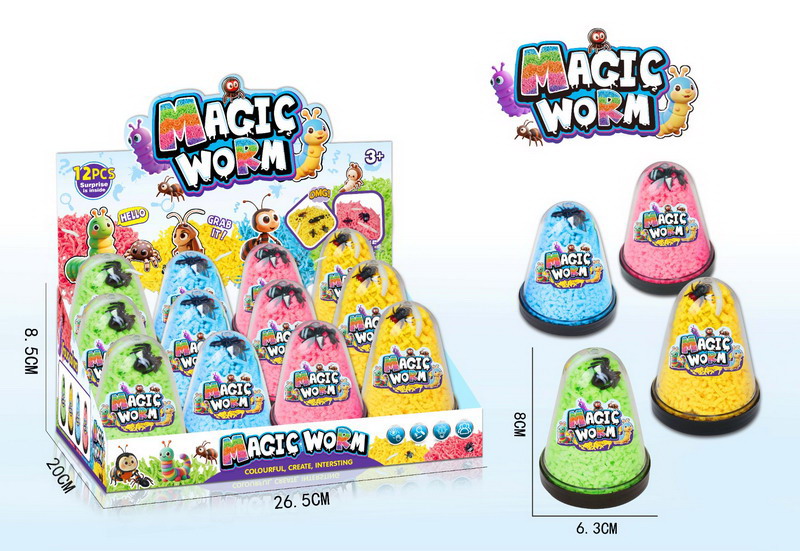 Červíci. Rozměry 6,3x6,3x8 cm. 12 ks display box. 4 varianty - zelená, modrá, růžová, žlutá.