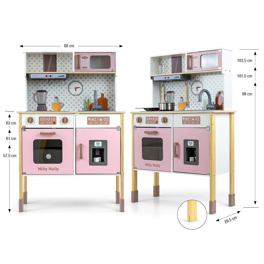 Milly Mally vsadila na bohaté vybavení, které zahrnuje pánev, hrnec s pokličkou a dřevěné vařečky k zavěšení na háčky pod digestoří. Děti se díky této hračce učí odpovědnosti za vlastní kuchyň a úklid při hře. Tato kuchyně je také vybavena výškově nastavitelnými nožkami, což zaručuje, že roste spolu s dítětem.