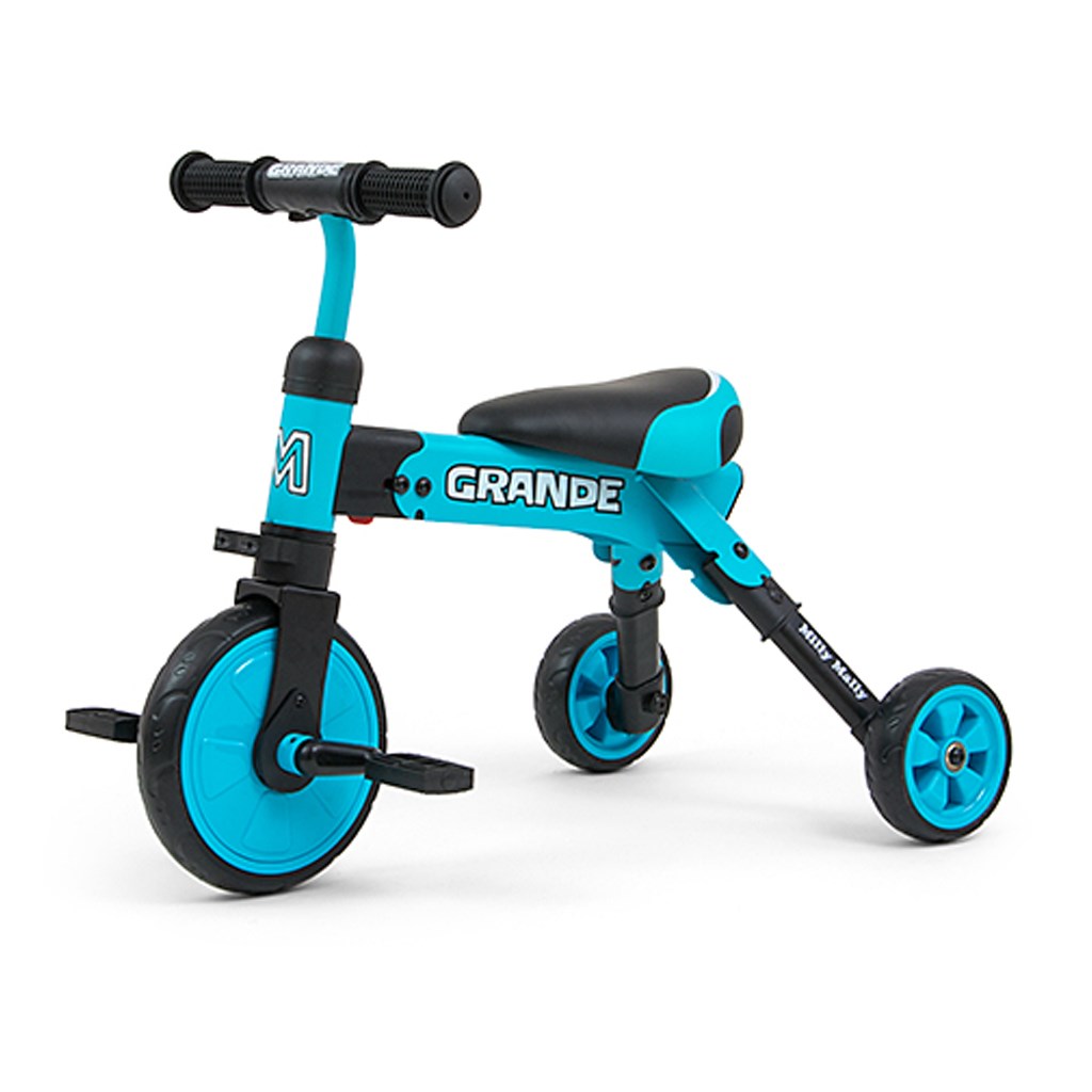 Kompaktní dětská šlapací tříkolka Milly Mally 2v1 Grande je ideálním řešením pro děti, které se právě začínají učí jezdit na kole a přitom ještě nejsou schopné udržet rovnováhu na dvou kolech. Je vyrobena z kvalitních a odolných materiálů a je ideální na procházky. Velkou výhodou této tříkolky je snadná montáž pedálů a nebo snadné složení celé tříkolky. Pěnová kola výborně absorbují rázy, poskytují dobrou přilnavost, zajistí pohodlí během jízdy a neunaví vašeho malého závodníka. Dostatečný rozvor kol poskytuje mimořádnou stabilitu, bezpečnost během používání doma i venku. Měkké a neklouzavé rukojeti zajistí pevné držení řídítek. Doraz nedovolí přetočení řídítek.