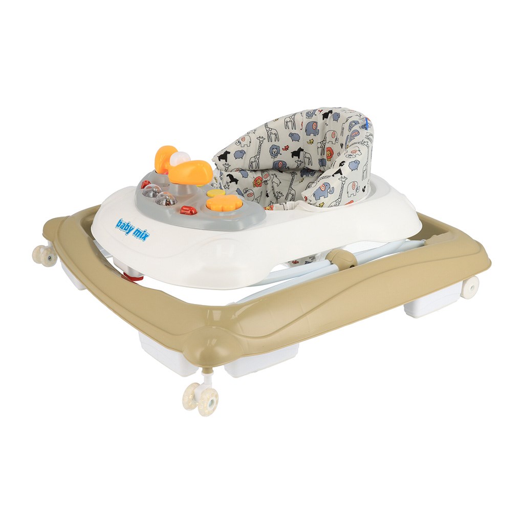 Multimediální chodítko Baby Mix se silikonovými kolečky. Chodítko je vybaveno pohodlným ergonomicky tvarovaným sedadlem, které zajišťuje správné držení páteře. Multimediální panel obsahuje různé světelné efekty, troubící volant, kterým lze otáčet, tlačítka pro přehrávání melodií a dvě světla. Krásné chodítko s hračkami okouzlí malé objevitele a umožní jim hrát si ještě déle. Chodítko je vybaveno speciálním systémem proti převrácení, který zajistí Vašemu dítěti pohodlí a bezpečnost.