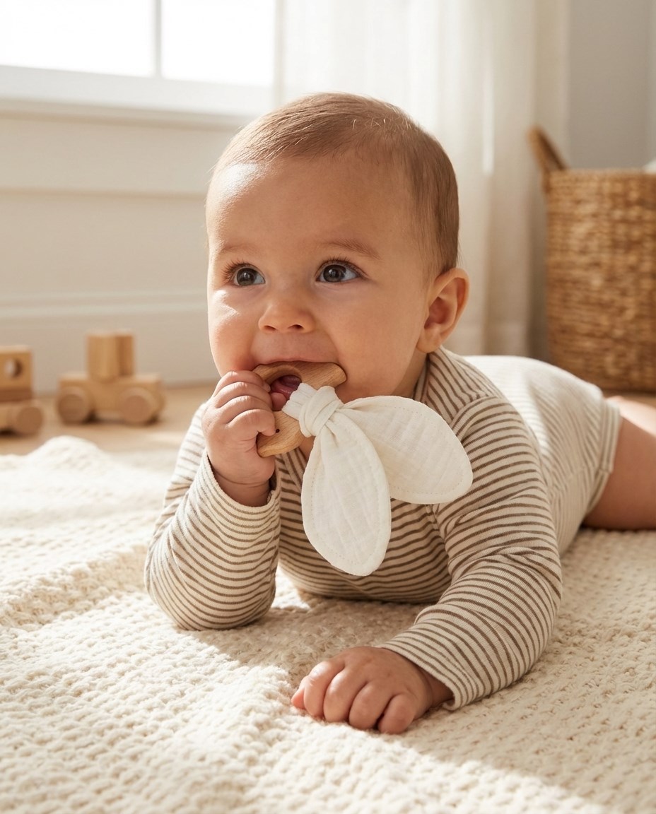 Kousátko s mušelínovou plenou je ideální sada, když se dítěti prořezávají zoubky. Kousátko je vyrobeno z bukového dřeva šetrného ke středu a měkké mušelínové látky. Zcela bezpečné pro děti přináší uklidňující úlevu při prořezávání zoubků. Kousátko lze použít také jako hračku pro miminka. Kousátko se dokonale hodí k našim dalším mušelínovým výrobkům a vytváří tak krásnou sadu, kterou lze darovat na dětskou oslavu.