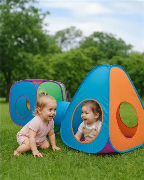 Krásný dětský stan Baby Mix 3v1 je trojdílnou sadou, skládájící se ze dvou samostatných stanů propojených plazícím tunelem. Snad každé dítě si rádo staví improvizované stany s pomocí židlí, stolu a dek, u nás máte vystaráno. Díky naší sadě dvou stanů propojených vzájemně tunelem budou mít vaše děti o zábavu postaráno. Ať už ve svém pokojíčku, v létě na zahradě, nebo na pláži zažijí s ním spoustu skvělé zábavy a nikdy nekončící aktívní pohyb. Pro celý komplet, oba stany i tunel, je typické rychlé a jednoduché rozložení i složení. Díky tomu můžete dětem postavit tuto skvělou prolézací sestavu kdekoli a doslova za pár sekund. Tunel se do stanů jen zasune, není na pevno připevněn, lze s ním libovolně manipulovat. Otvory zajišťují dobrou cirkulaci vzduchu. Je vyrobený z kvalitní a pevné látky. Určeno pro děti od 3let.