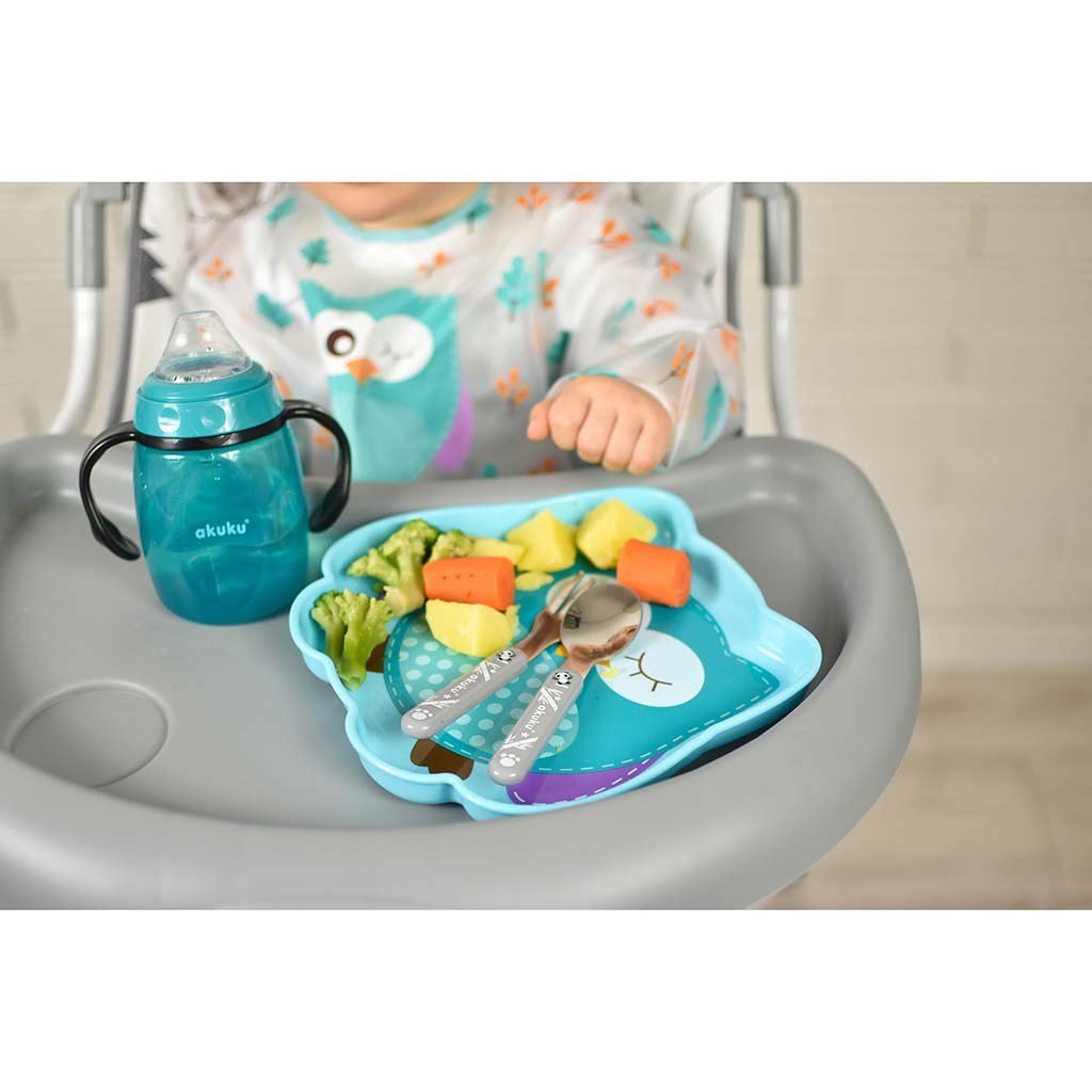 Představujeme plastový talíř AKUKU. Byl navržený tak, aby svými tvary a barvami motivoval dítě k samostatnosti při jídle. Je vyroben z bezpečných materiálů určených pro styk s potravinami. K dispozici ve dvou provedeních - slon a sova.