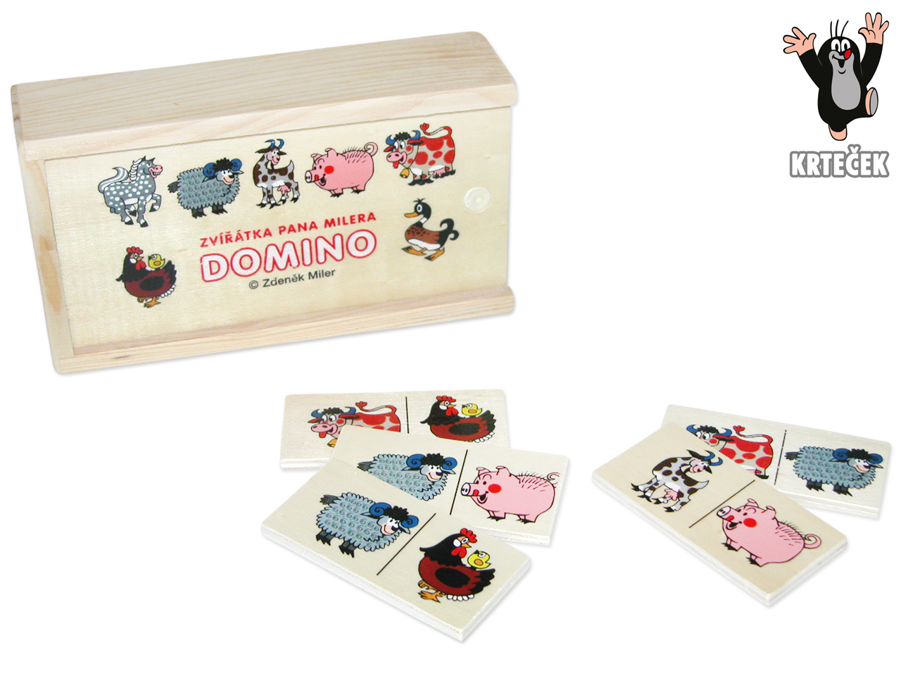 Domino dřevěné Krtek. S motivy zvířátek pana Milera. Rozměry dřevěné krabičky 16x9,2x4,5 cm. Návod součástí.