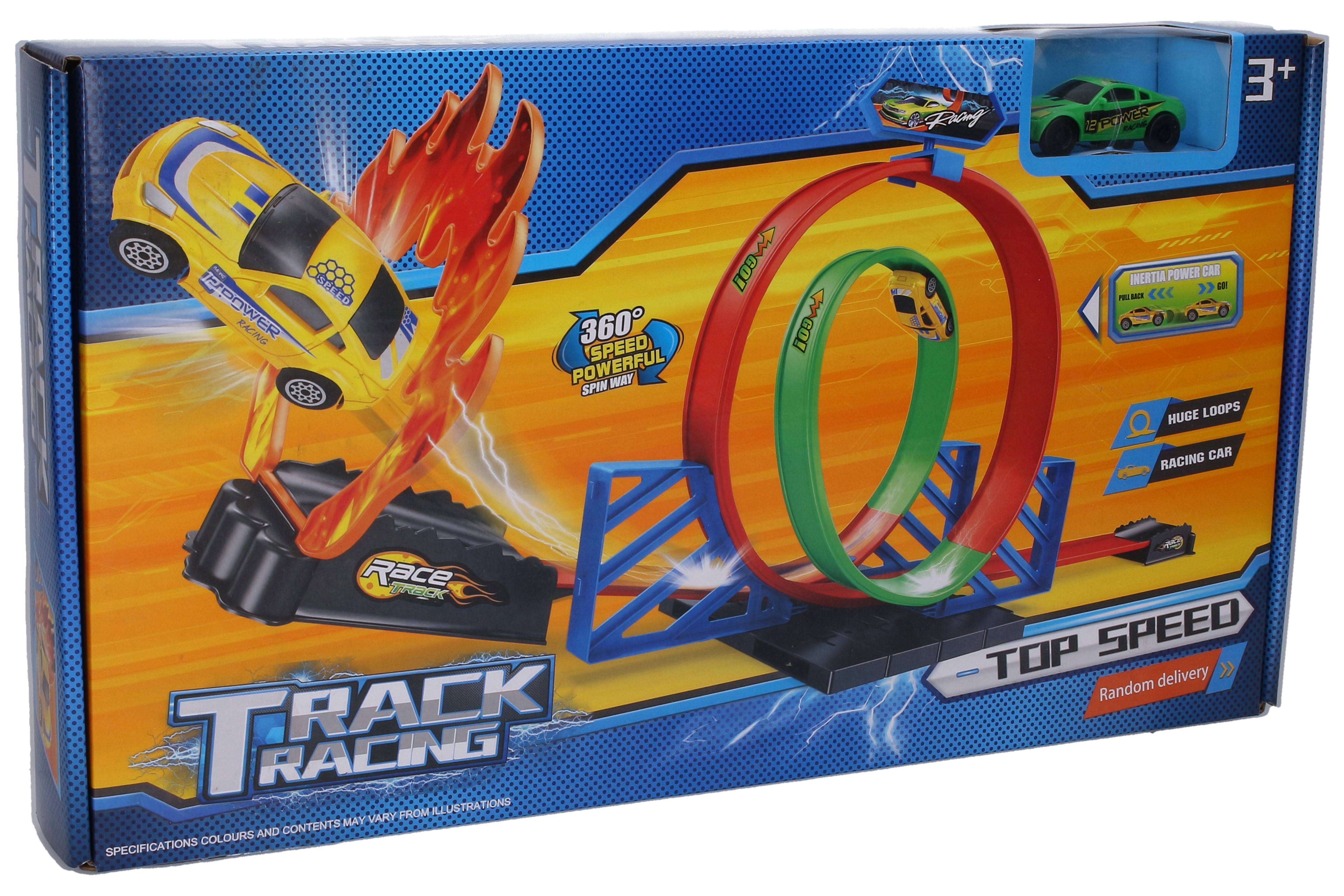 Dráha se smyčkou a ohnivou rampou. Rozměry sestavené dráhy 100x22x27 cm. Obsahuje 1 auto na zpětné natažení. Schéma na sestavení se nachází na zadní straně obalu.