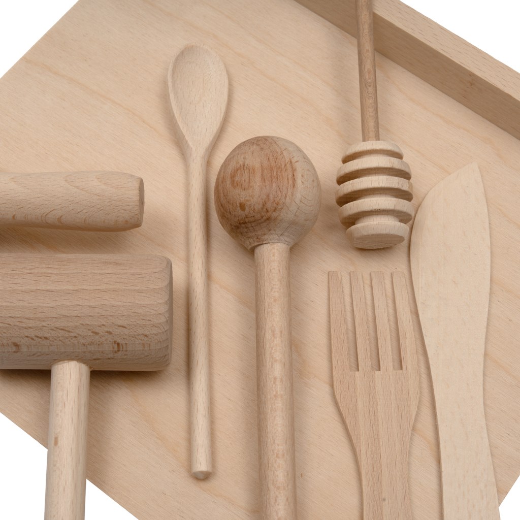 Krásná dřevěná kuchyňská sada pro malé šéfkuchaře.