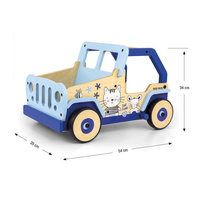 Toto dětské chodítko, inspirované legendárními terénními auty, je vyrobeno z vysoce kvalitního dřeva a ekologických materiálů. Kryty kol jsou vyrobeny z měkkého TPR plastu, který je flexibilní a odolný a umožňuje použití na všech površích bez poškození nebo poškrábání. Neobsahují změkčovadla a jsou šetrné k životnímu prostředí.