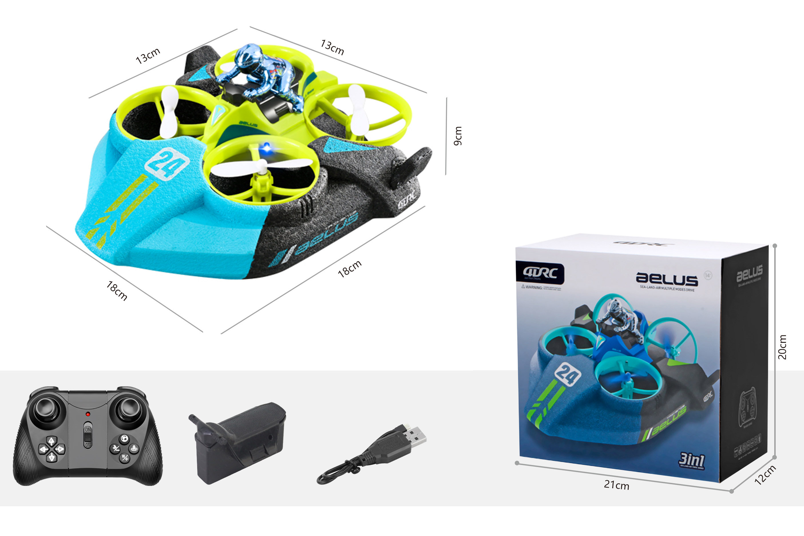 Dron Aelus 3v1 RC na dálkové ovládání. Bez kamery. 3 módy - létání, jízda na vodě, jízda po pevném povrchu. Rozměry 18x18x9 cm. 3.7V 450mAh bateriový pack do dronu součástí, 3xAAA do ovladače nejsou součástí. USB kabel součástí. Provoz 7 min, nabíjení 60 min, dosah ovladače 80-100 m. Funkce - pohyb na místě, obrat o 360 stupňů, návrat do výchozí polohy. Přepínač ON/OFF na ovladači.