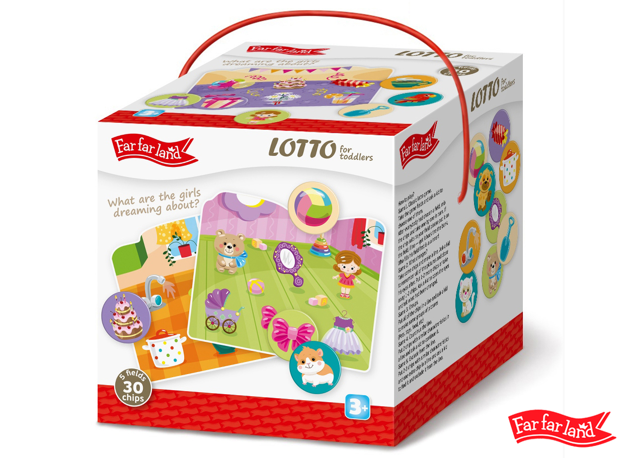 Far Far Land Lotto kartičky pro holky. Balení obsahuje 30 žetonů a 5 hracích polí, s motivy pro holky.