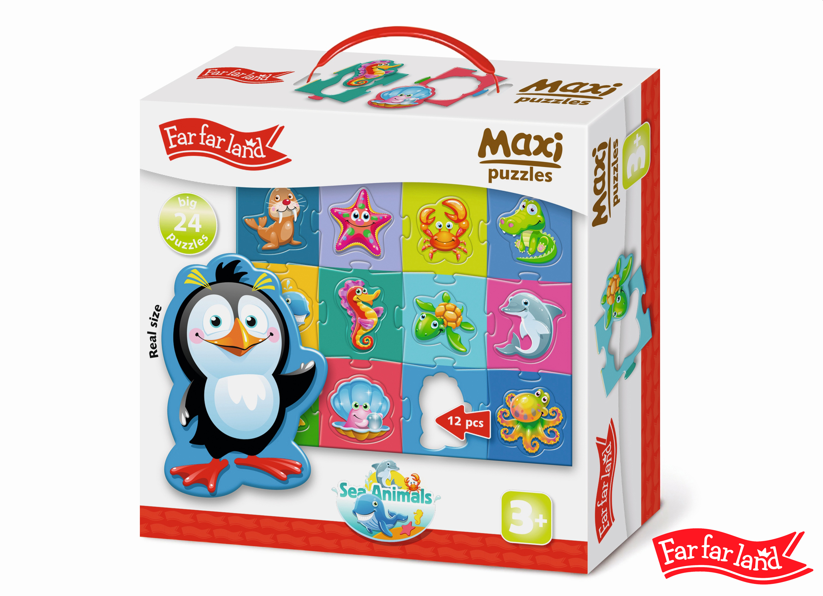 Far Far Land Maxi Puzzle mořská zvířátka. Balení obsahuje 24 dílků (12 puzzle dílků + 12 dílků se zvířátky). Složené 61x47 cm.