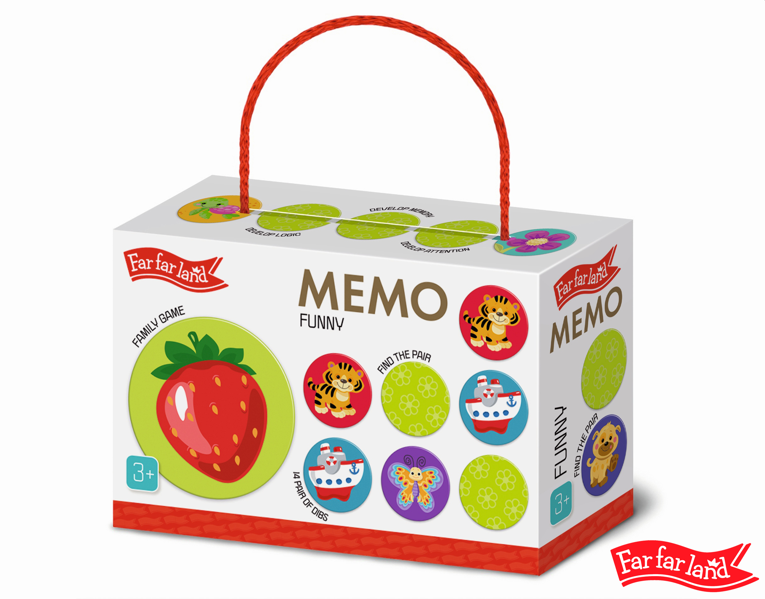 Far Far Land Pexeso kolečka. Balení obsahuje 28 kartiček ve tvaru kolečka s obrázky.