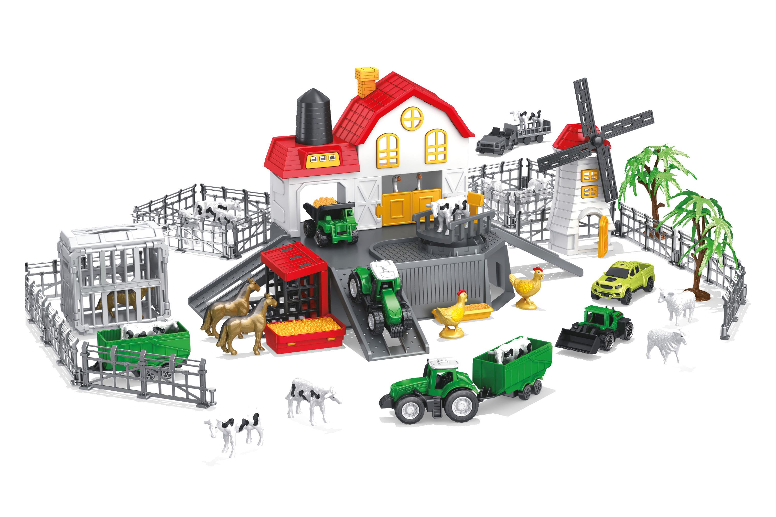 Farma se zvířátky. Součástí vše z obrázků na obalu - farma, mlýn, traktor s vlečkou, sklápěč, nakladač, přepravní vozidlo, ohrada, stromy, figurky zvířátek (koně, slepice, ovce, kozy, pes). Obrázkový návod na složení na zadní straně obalu.
