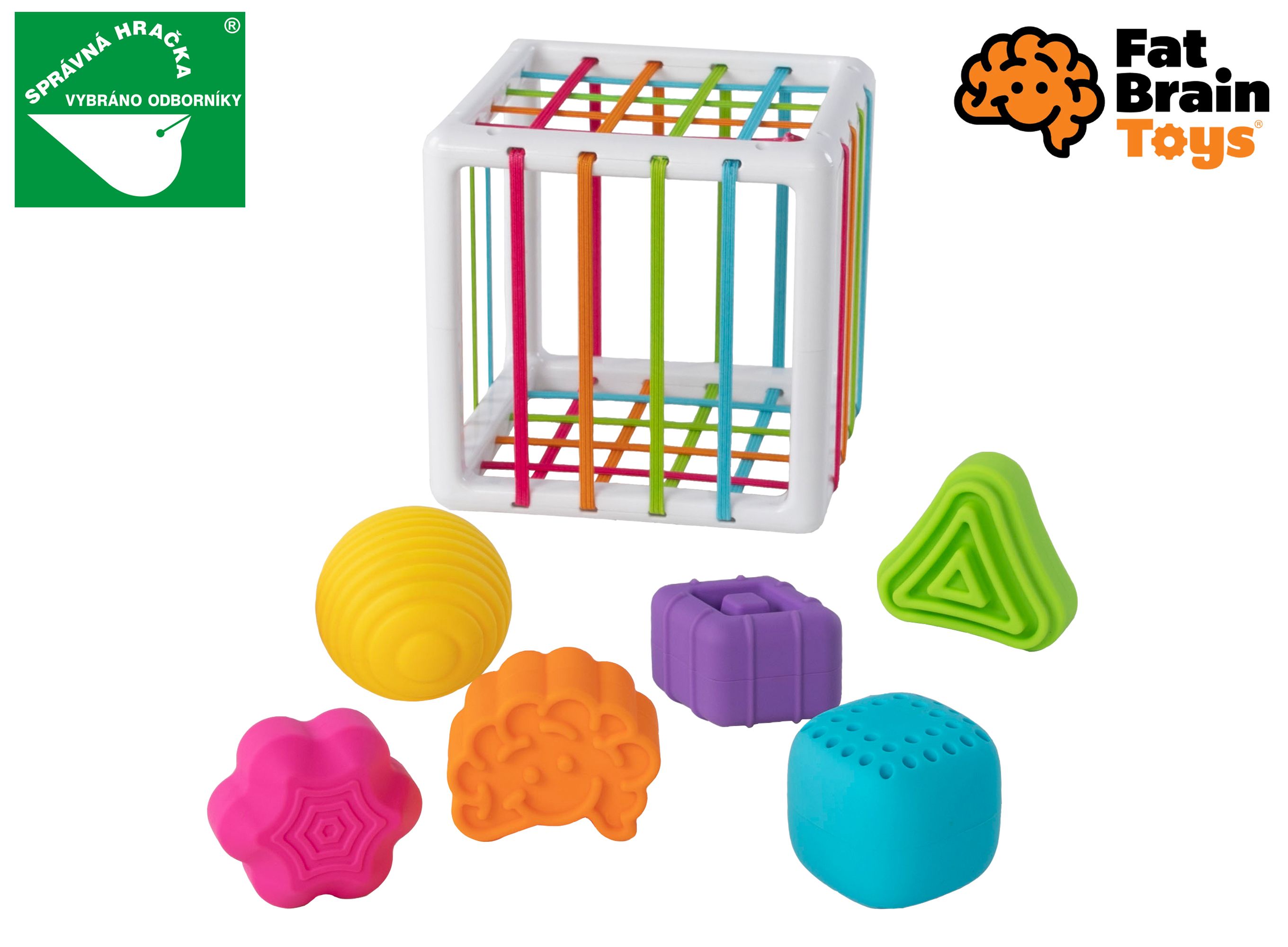 InnyBin mřížkovaná vkládačka. Rám kostky je z plastu. Mřížku tvoří elastické provázky. Různě tvarované kostky z měkkého materiálu lze jednoduše prostrkávat skrz mřížku.