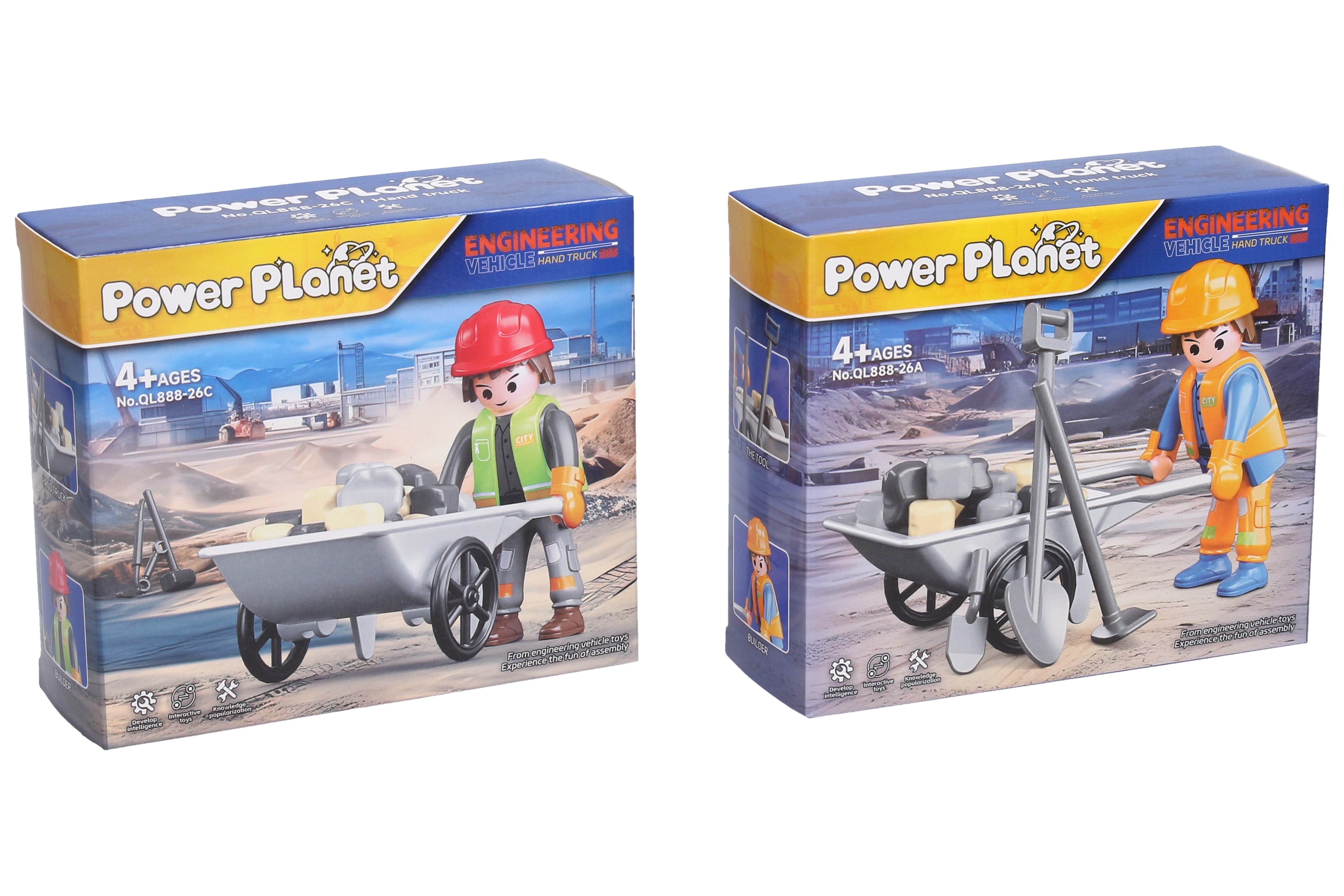 Figurka dělník s kolečkem stavebnice. Velikost kolečka 8,5 cm. Velikost figurky 7 cm. Obsahuje: figurku dělníka, kolečko, náklad, nářadí, návod. Display box - 8 ks. 4 varianty.