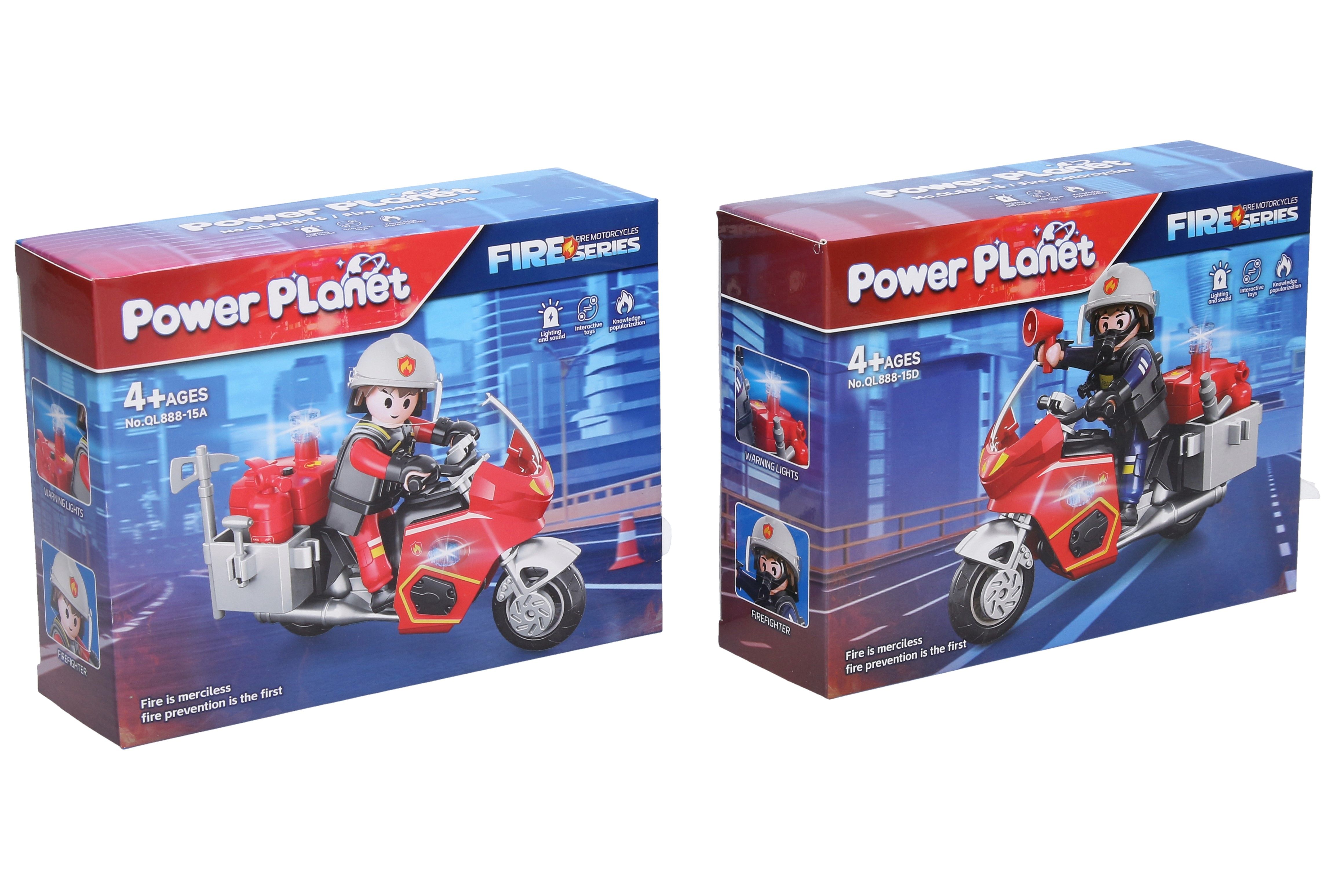 Figurka hasič na motorce stavebnice. 3xLR754 (AG5) baterie nejsou součástí. Velikost figurky 7 cm, velikost motorky 11 cm. Světelné efekty. Tlačítko on/off, obsahuje: figurku hasiče, motorku, návod. Motorka má blikající maják. Display box - 8 ks. Více variant.