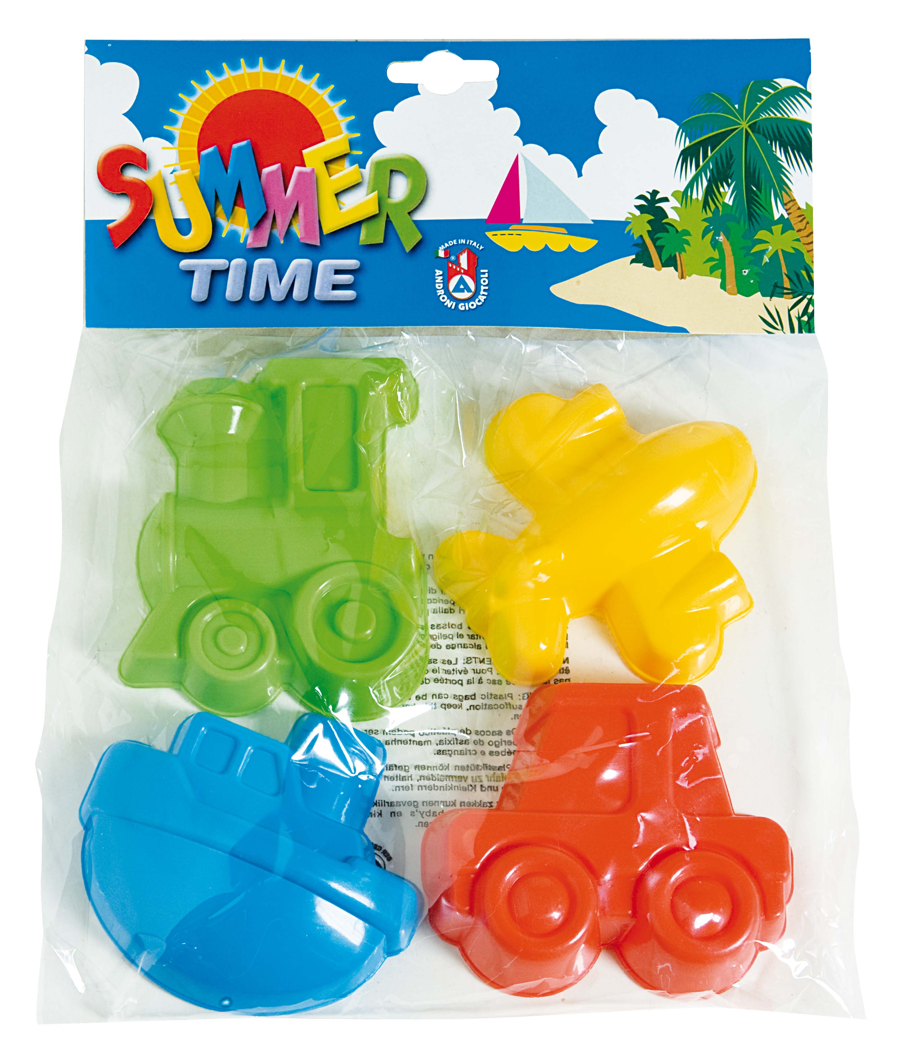 Praktická sada báboviček na písek. Set obsahuje 4 ks báboviček v designu dopravních prostředků.