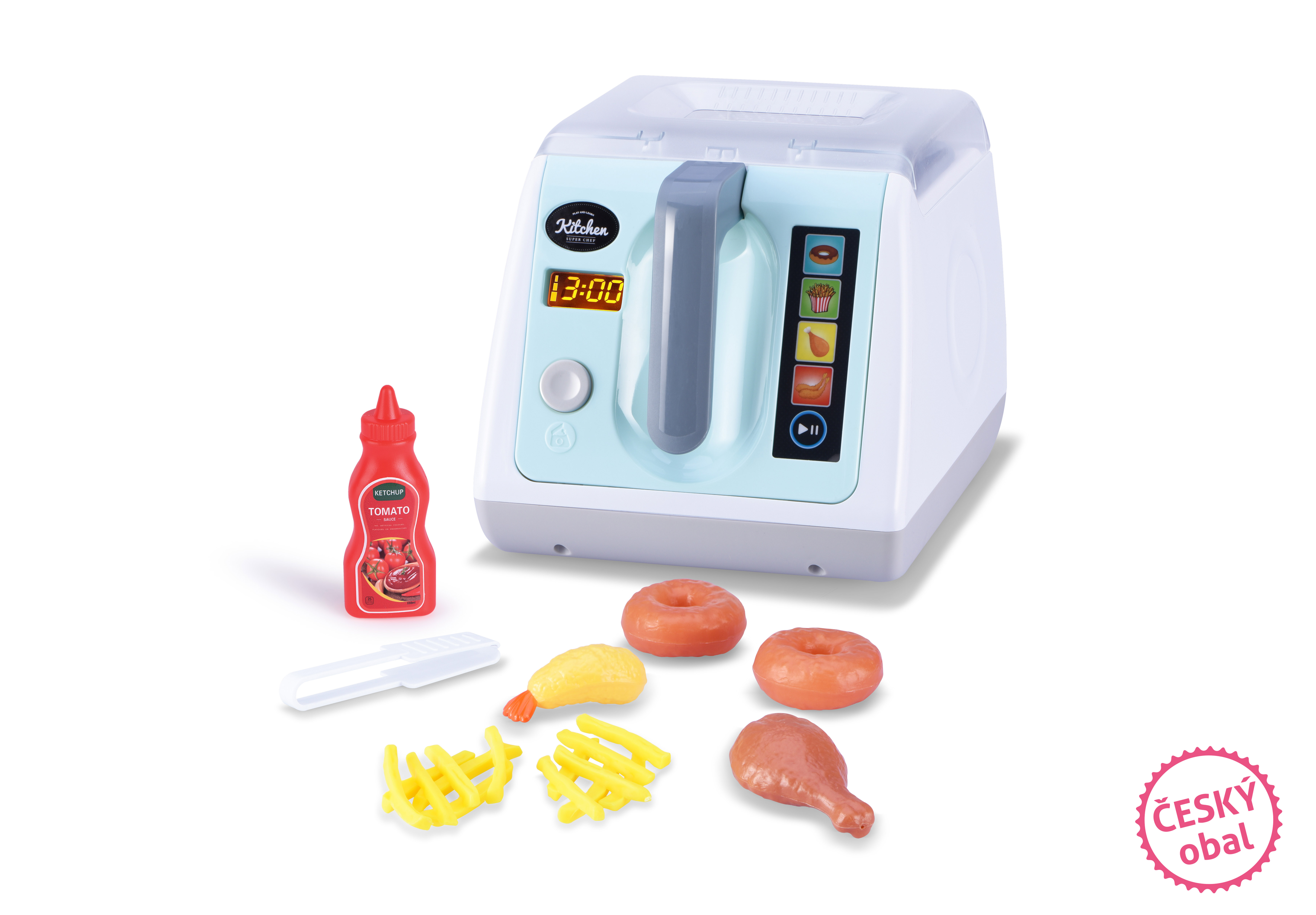 Fritéza při smažení svítí a vydává zvuky jako opravdová a nechybí ani časovač! Tak dobrou chuť!