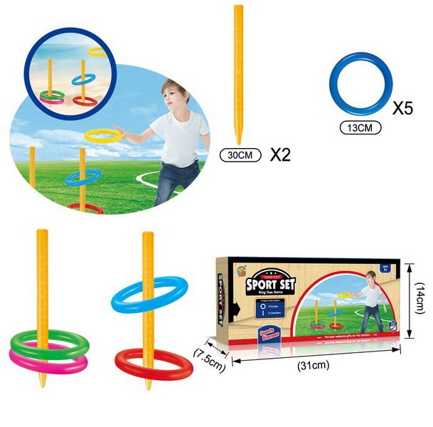 Házení kroužků set. Obsah balení - 2 x kolík (30 cm), 5 x kroužek (13 cm).